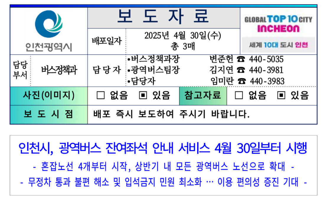 인천광역시(시장 유정복)는 시민들의 광역버스 이용 편의를 높이기 위해 2025년 4월 30일부터 광역버스에 잔여좌석 안내 서비스를 시작했다고 밝혔습니다.