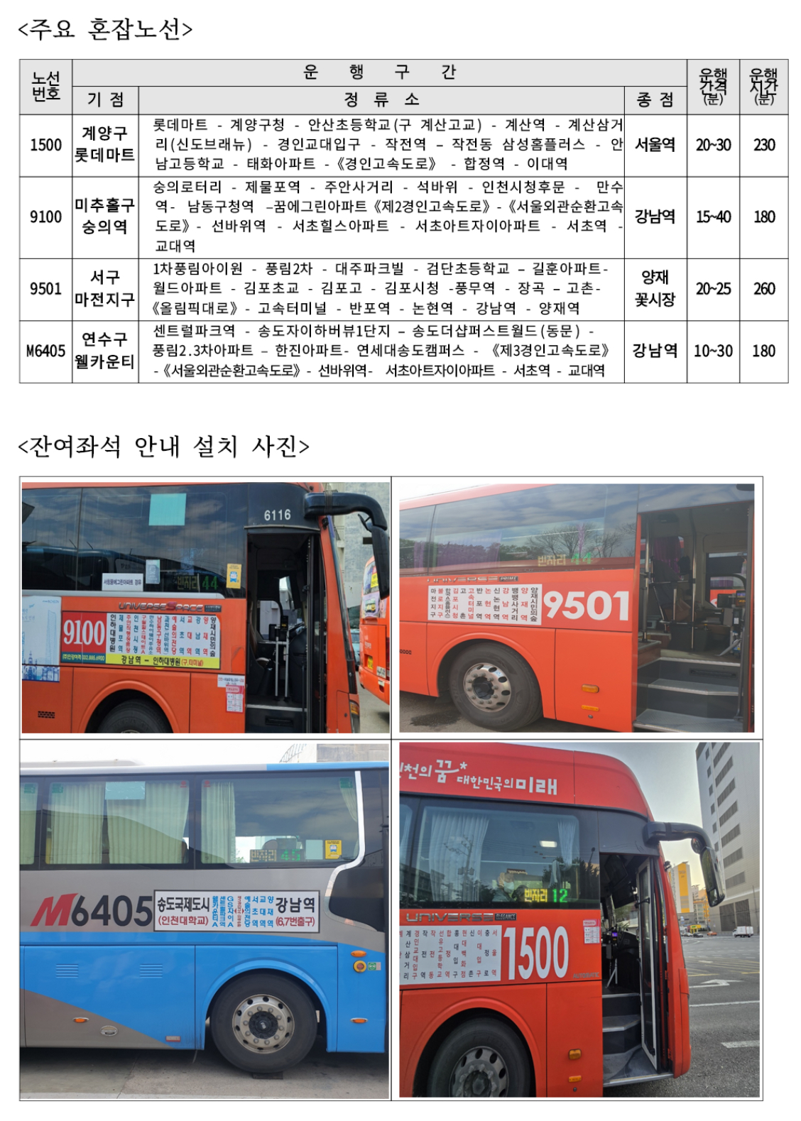 또한, 인천시는 광역버스 정류장 개선과 함께, 버스 전면부에 발광다이오드(LED) 전광판과 전자노선도를 추가 설치할 예정이라고 합니다.