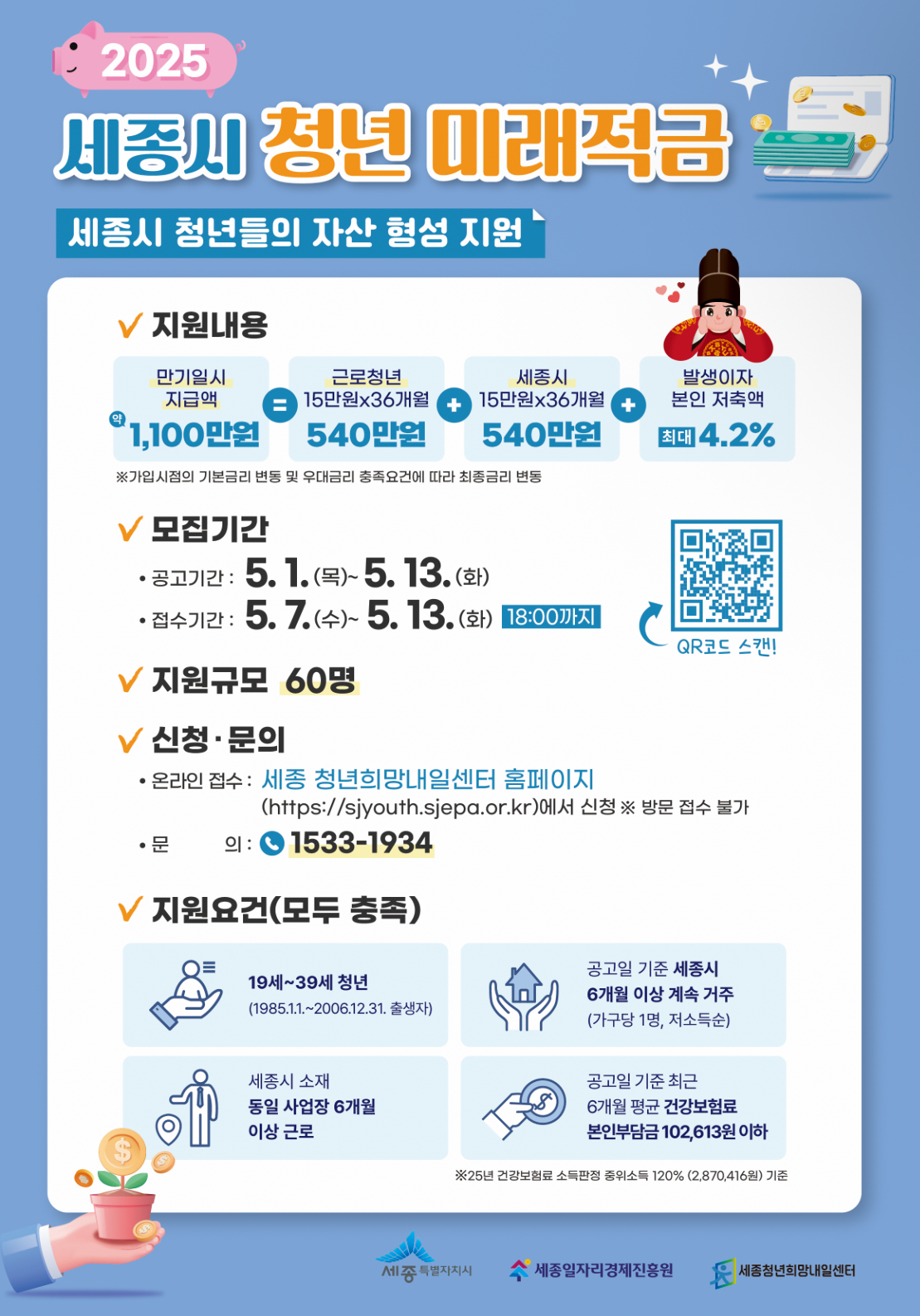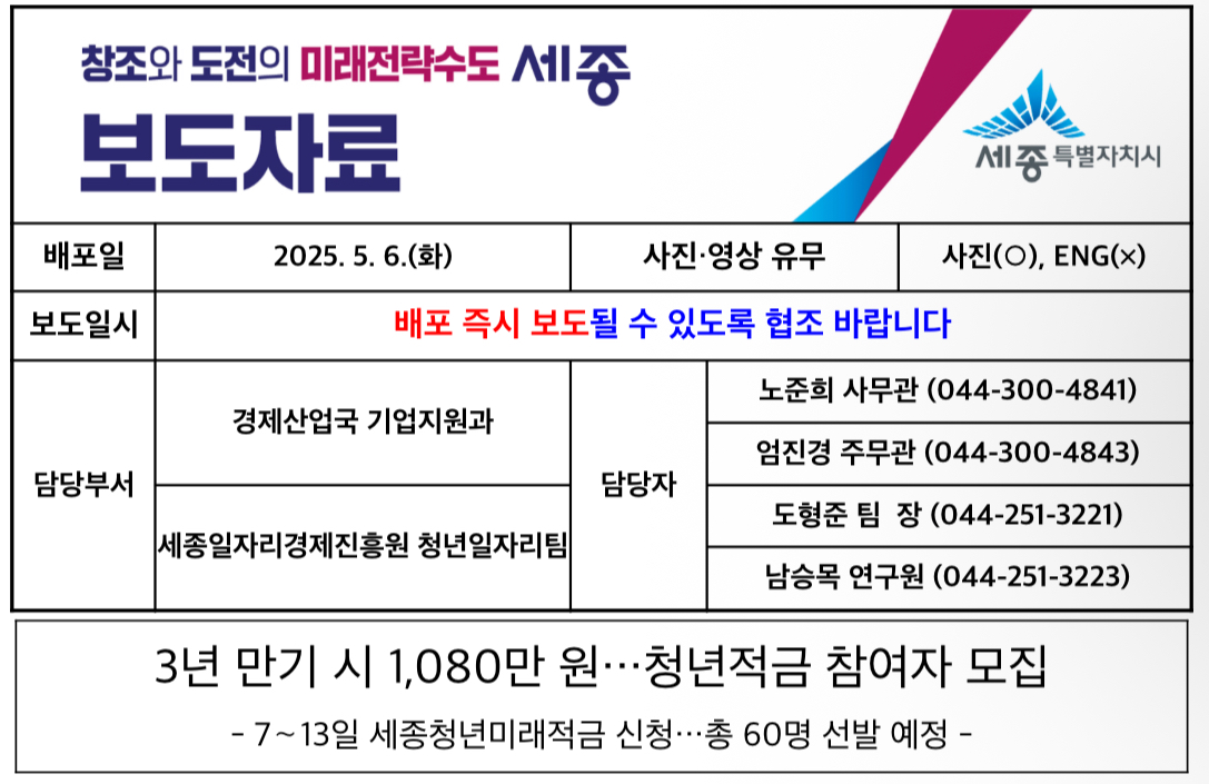 세종특별자치시(시장 최민호)와 세종일자리경제진흥원(원장 이홍준)이 오는 2025년 5월 7일부터 13일까지 ‘2025년 세종청년미래적금’ 참여자를 모집한다고 밝혔습니다.