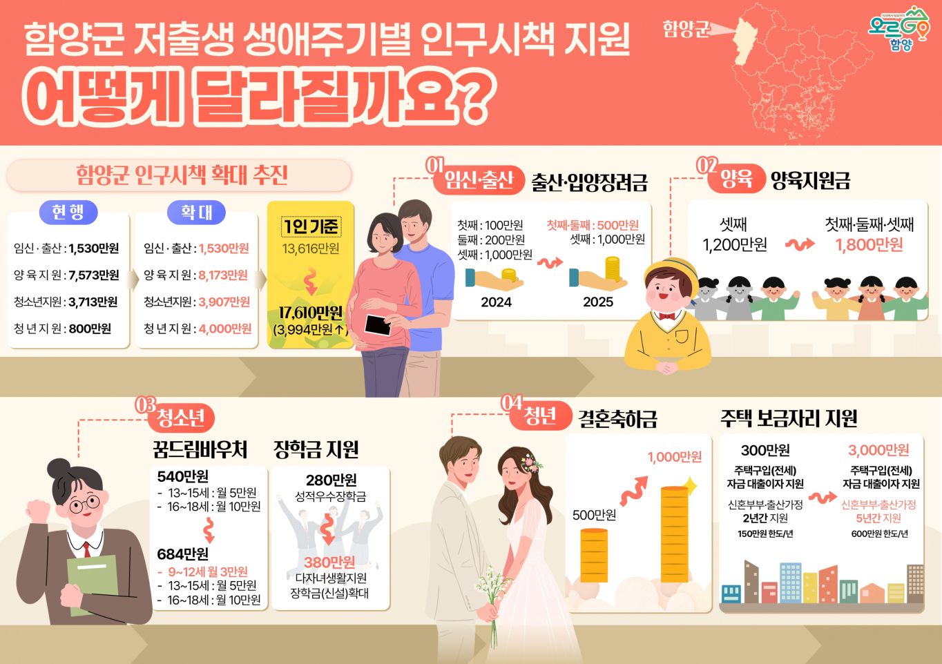 특히 함양군은 출산과 양육, 교육, 청년 정착까지 전 세대를 아우르는 맞춤형 지원으로 1인당 최대 1억3600만원까지 지원되며 향후 1억7600만원으로 확대할 방침이라고 밝혔습니다.
