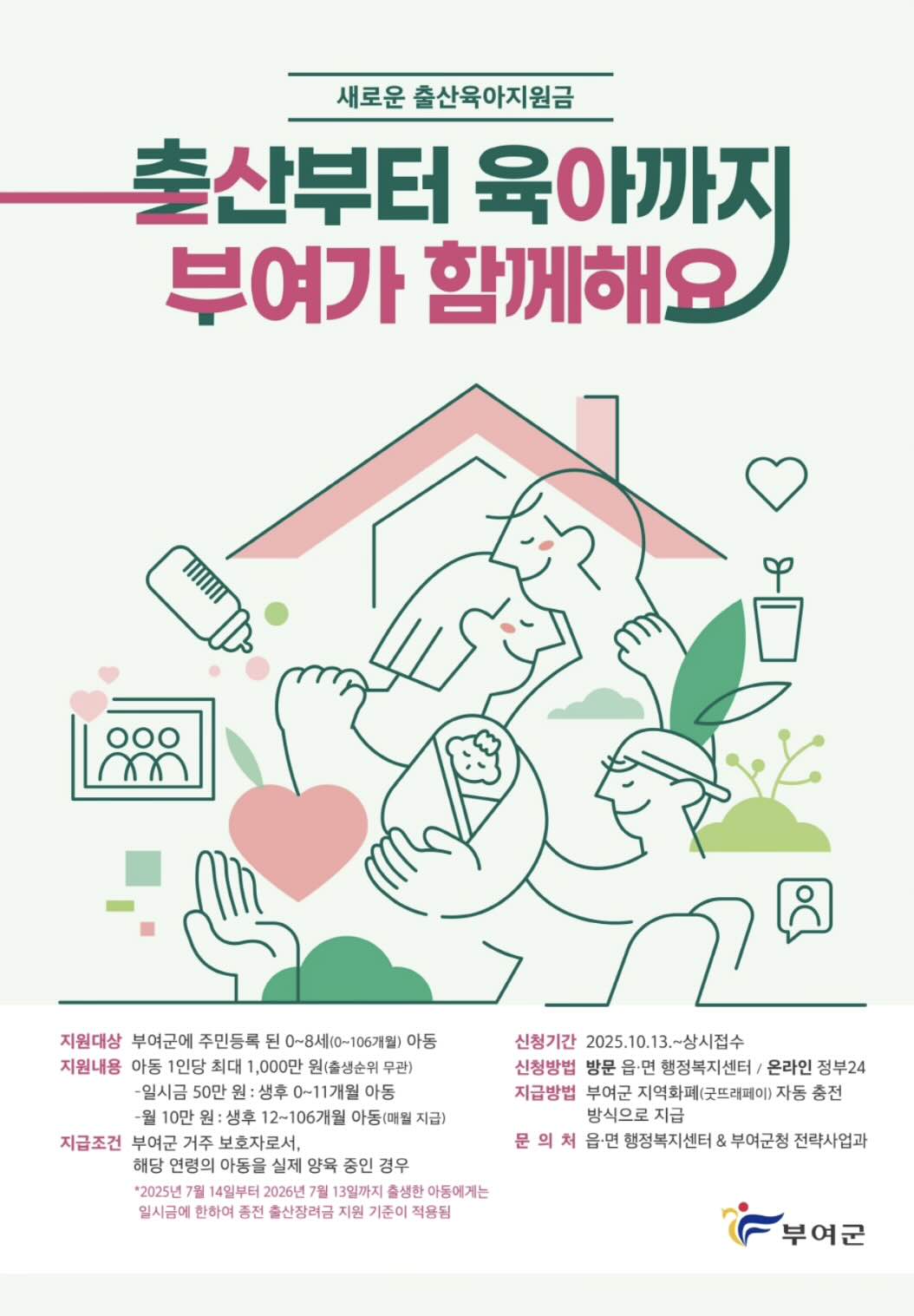 부여군(군수 박정현)이 저출산 위기에 대응하기 위해 기존 출산장려금 제도를 ‘출산육아지원금’으로 전면 개편하고 오는 2025년 10월 13일부터 신청을 시작한다고 밝혔습니다.