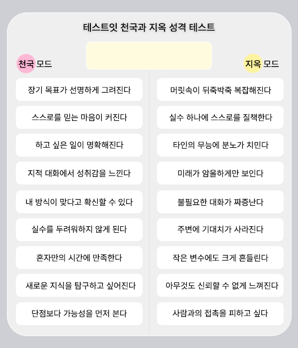 테스트잇이라는 사이트에서 ‘천국과 지옥 성격 테스트’라고 나왔는데 웃긴거같아서 여러분들께 소개드리겠습니다.