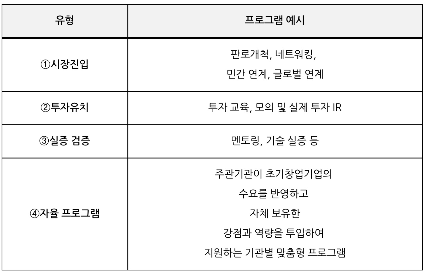 크게 기업의 시장진입, 투자유치, 실증 검증 등을 지원하기 위한 프로그램들로 구성되어 있습니다.