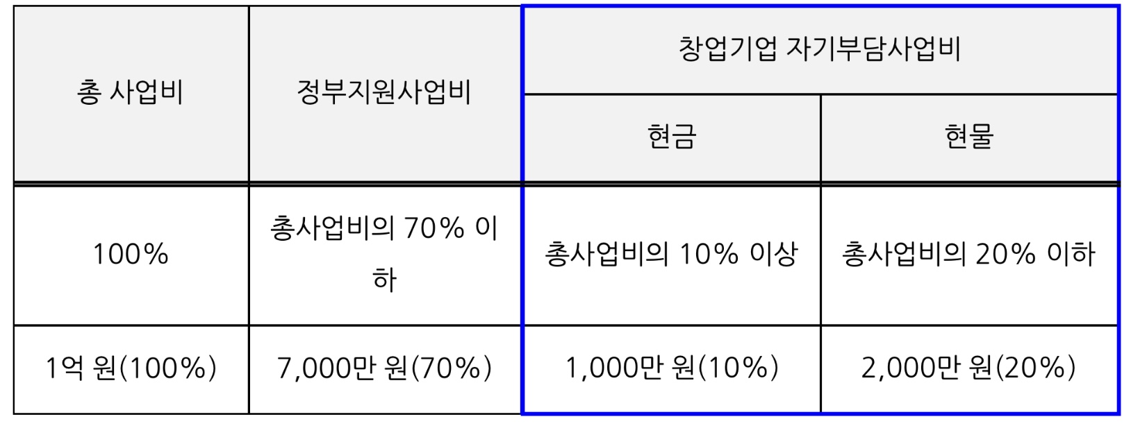 총사업비는 정부지원사업비 70% 이하 + 자기부담사업비 30% 이상으로 구성되고 자기부담사업비(30% 이상)에서는 현금과 현물 중 현금이 1/3 이상 차지해야 합니다.