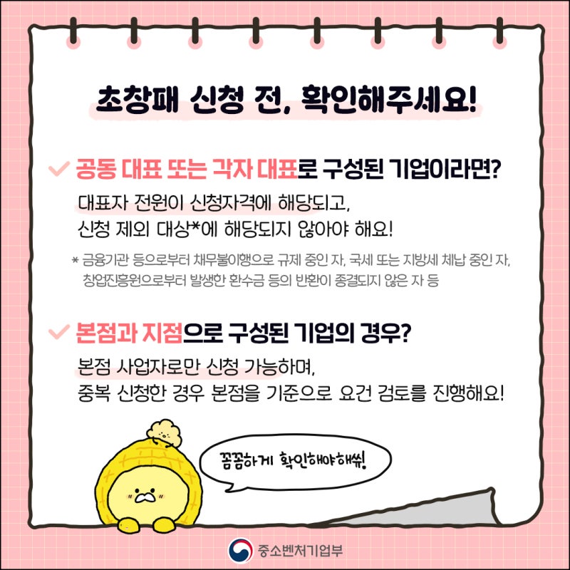 초창패는 「중소기업기본법」제2조제1항에 따른 중소기업의 대표자이자, 「중소기업창업 지원법」 제2조제2호·제2의2호, 제2조제3호·제3의2호, 제2조제10호에 따른 초기창업기업의 대표자로서 (모집)공고일 기준 창업 3년 이내인 자가 신청가능합니다.