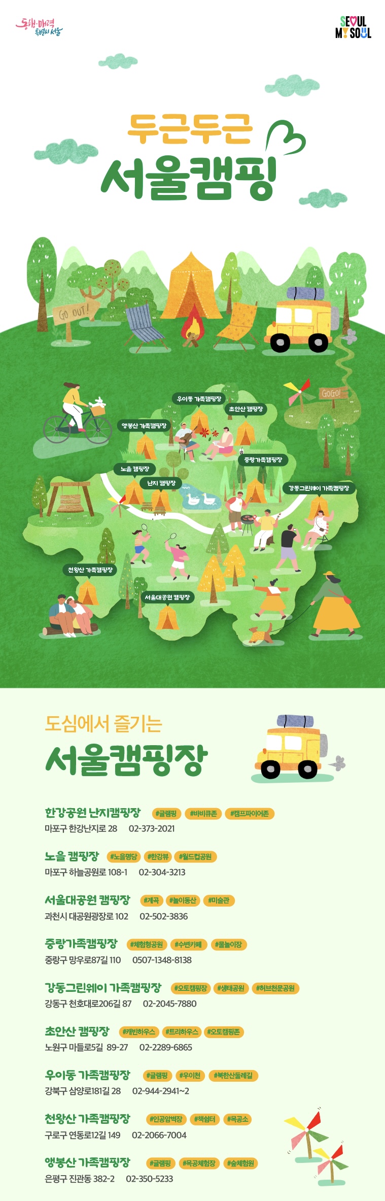 이번 포스팅에서는 서울시가 공식으로 안내하는 서울 캠핑장 추천 예약 한눈에 보는 서울도심은 물론, 지방폐교를 활용한 서울캠핑장 정보를 한 데 모았다는데 여러분들께 소개드리겠습니다.
