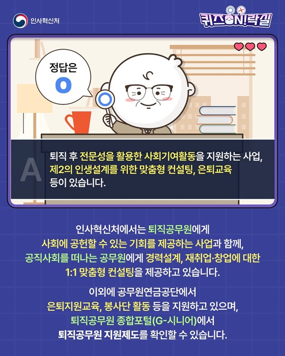 Q. 공무원 퇴직 후 제2의 인생설계를 위한 지원이 있나요?