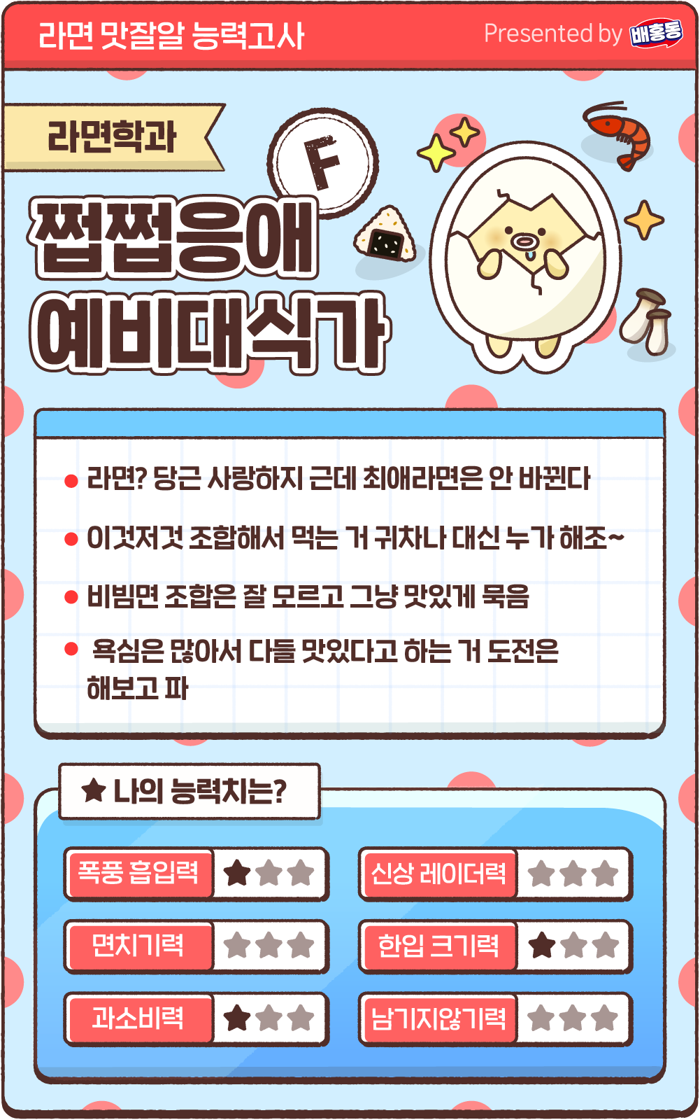 방구석연구소라는 사이트에서 ‘라면 맛잘알 능력고사’라고 나왔습니다.