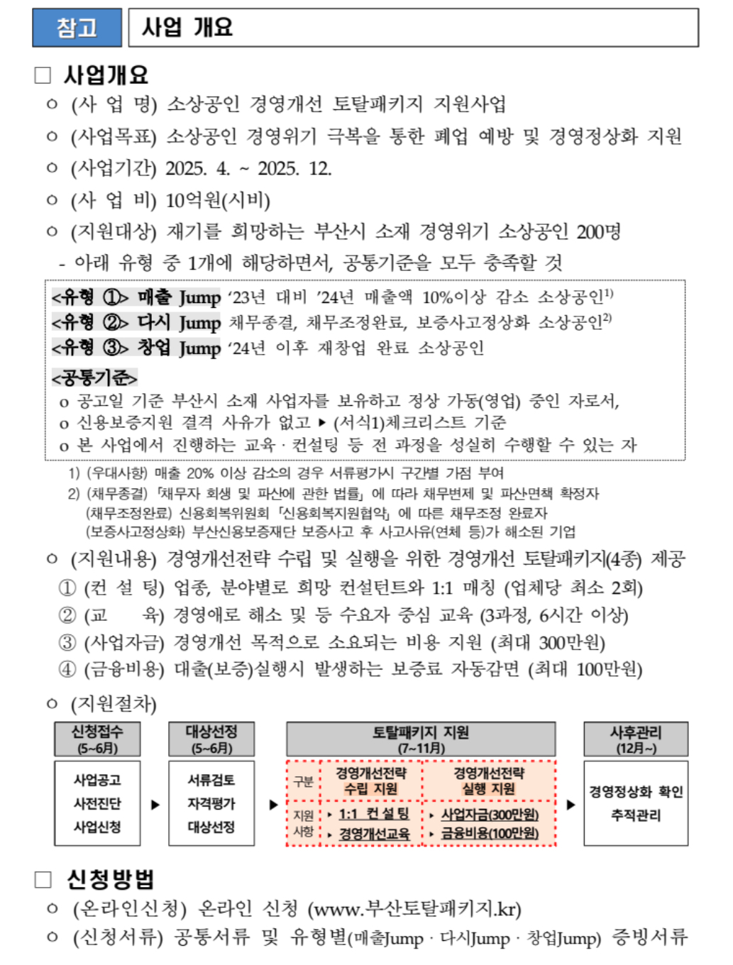 지원 대상은 신용보증 결격 사유가 없는 부산시 소재 경영위기 소상공인으로, 세 가지 유형(▲매출 JUMP ▲다시 JUMP ▲창업 JUMP) 중 선택해 신청할 수 있습니다.