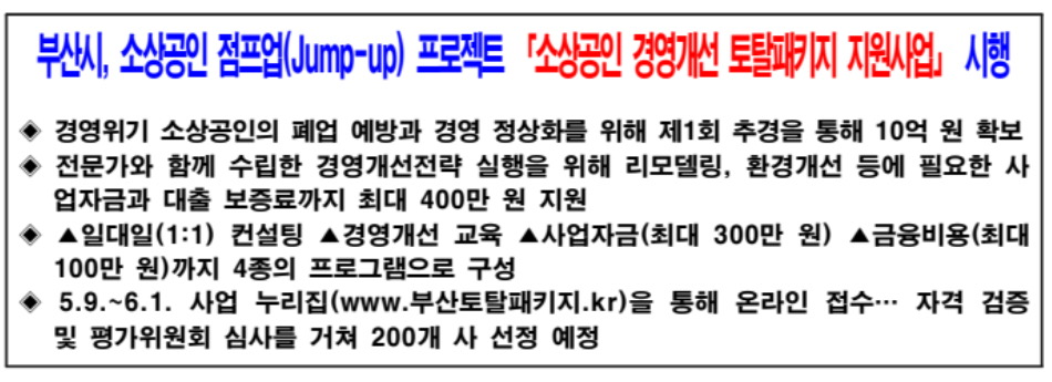 부산시(시장 박형준)는 47만 부산 소상공인의 폐업 예방과 경영 정상화를 지원하기 위해 「소상공인 경영개선 토탈패키지 지원사업」을 본격 시행한다고 밝혔습니다.