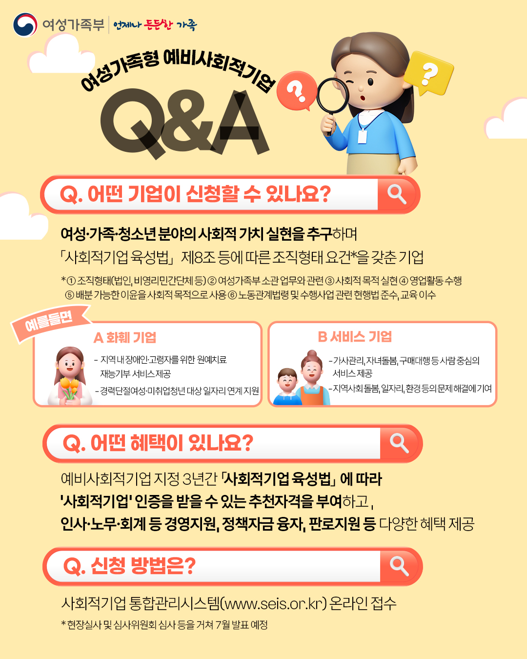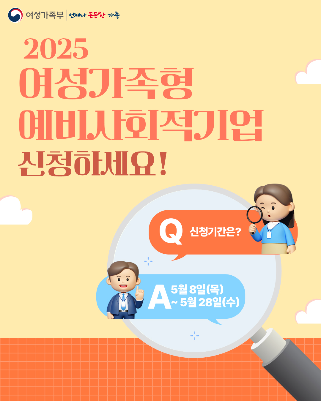 여성가족부는 2025년 5월 8일(목) ‘2025년 여성가족형 예비사회적기업 지정·신청’을 공고하고 5월 28일(수)까지 신청을 받는다고 밝혔습니다.