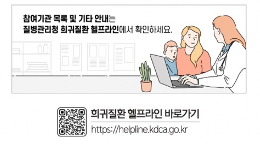 참여기관 목록 및 기타 안내는 질병관리청 희귀질환 헬프라인(https://helpline.kdca.go.kr/cdchelp/)에서 확인하시길 바랍니다.