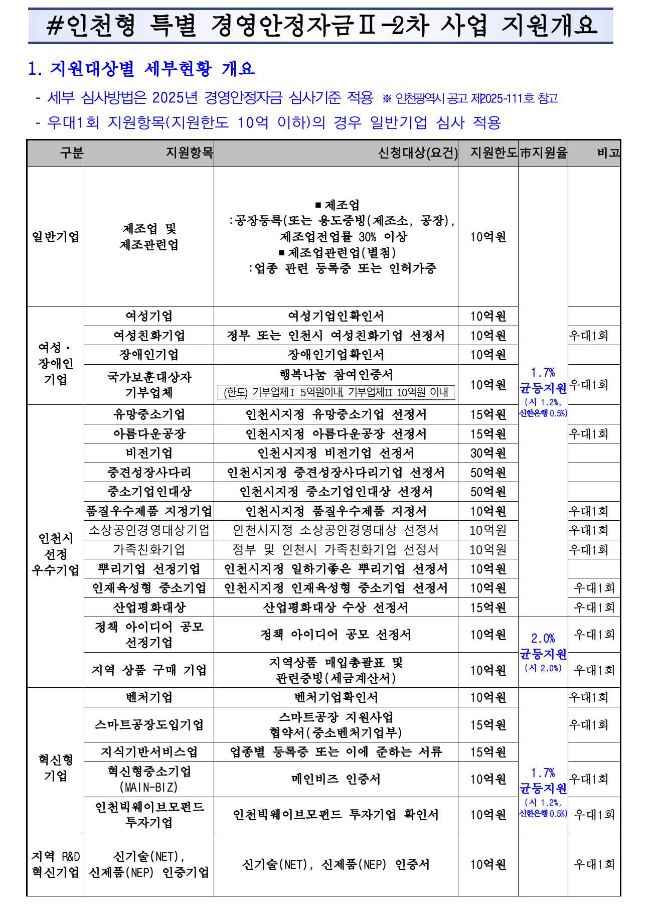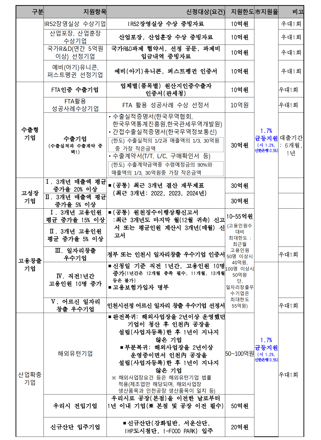 인천 중소기업 이자차액보전 특별자금 지원 대상은 중소기업 육성자금 지원 업종(관내 공장을 운영 중인 제조기업 또는 제조업 관련업)을 영위하면서 ㈜신한은행에서 대출받을 수 있는 기업으로, 지원 조건과 한도 등은 2025년도 인천시 중소기업 지원사업 공고 내용과 동일합니다.