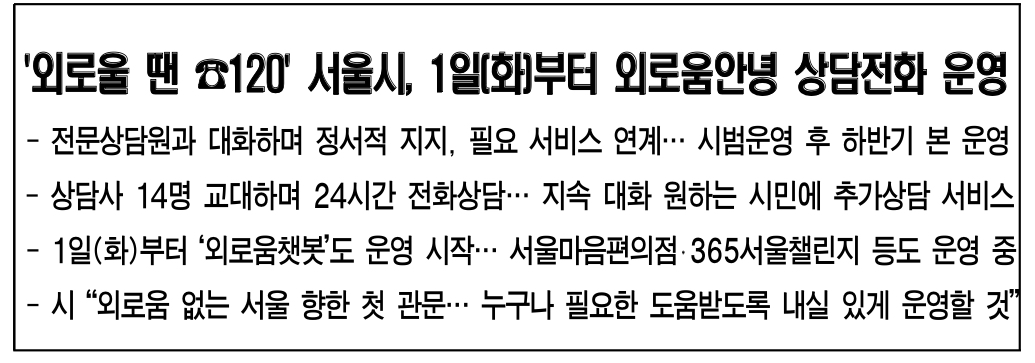 서울시는 4.1.(화) 오전 9시부터 「외로움안녕120」 시범 운영에 들어간다고 밝혔습니다.