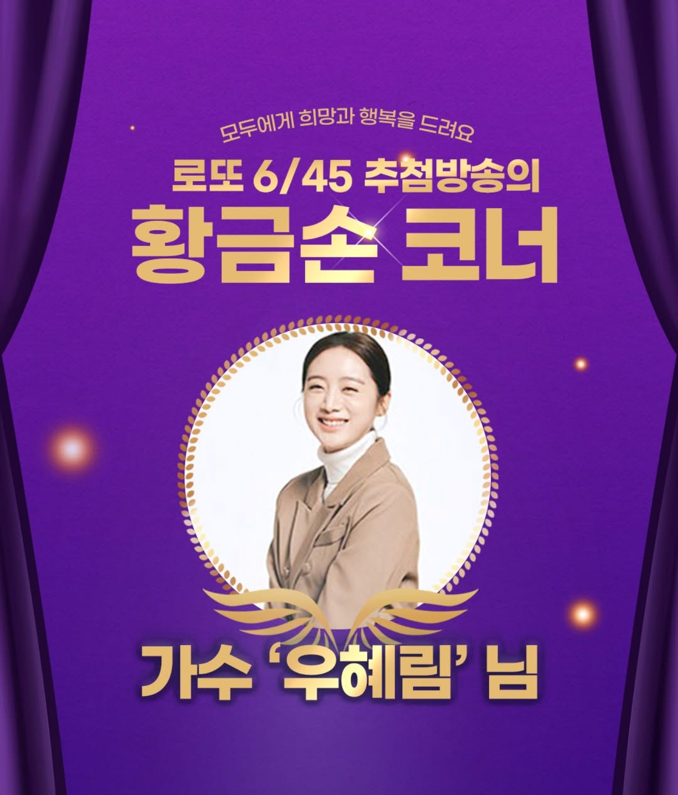 2025년 5월 세 번째 추첨일인 이날 선한 마음을 행동으로 전하며 따뜻한 나눔을 실천해 온 가수 우혜림이 제337대 ‘황금손’으로 초대됐습니다.