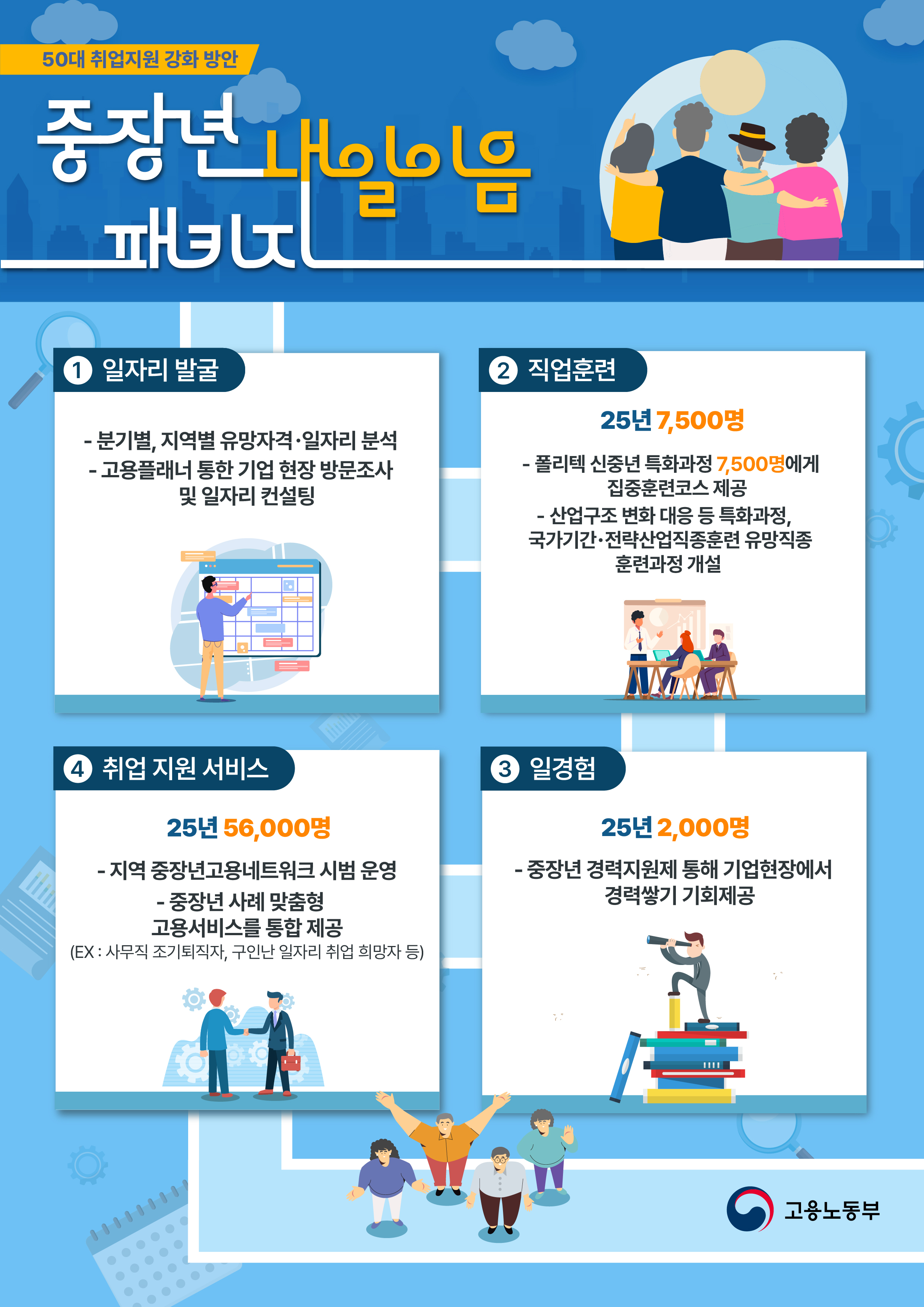 최근 50대 고용률이 12개월 이상 장기간 하락*하고, 주된 직장에서 퇴직 이후 재취업에 어려움을 겪는 상황인데 이에 대응하여 고용노동부는 「50대 취업지원 강화 방안」을 발표했습니다.