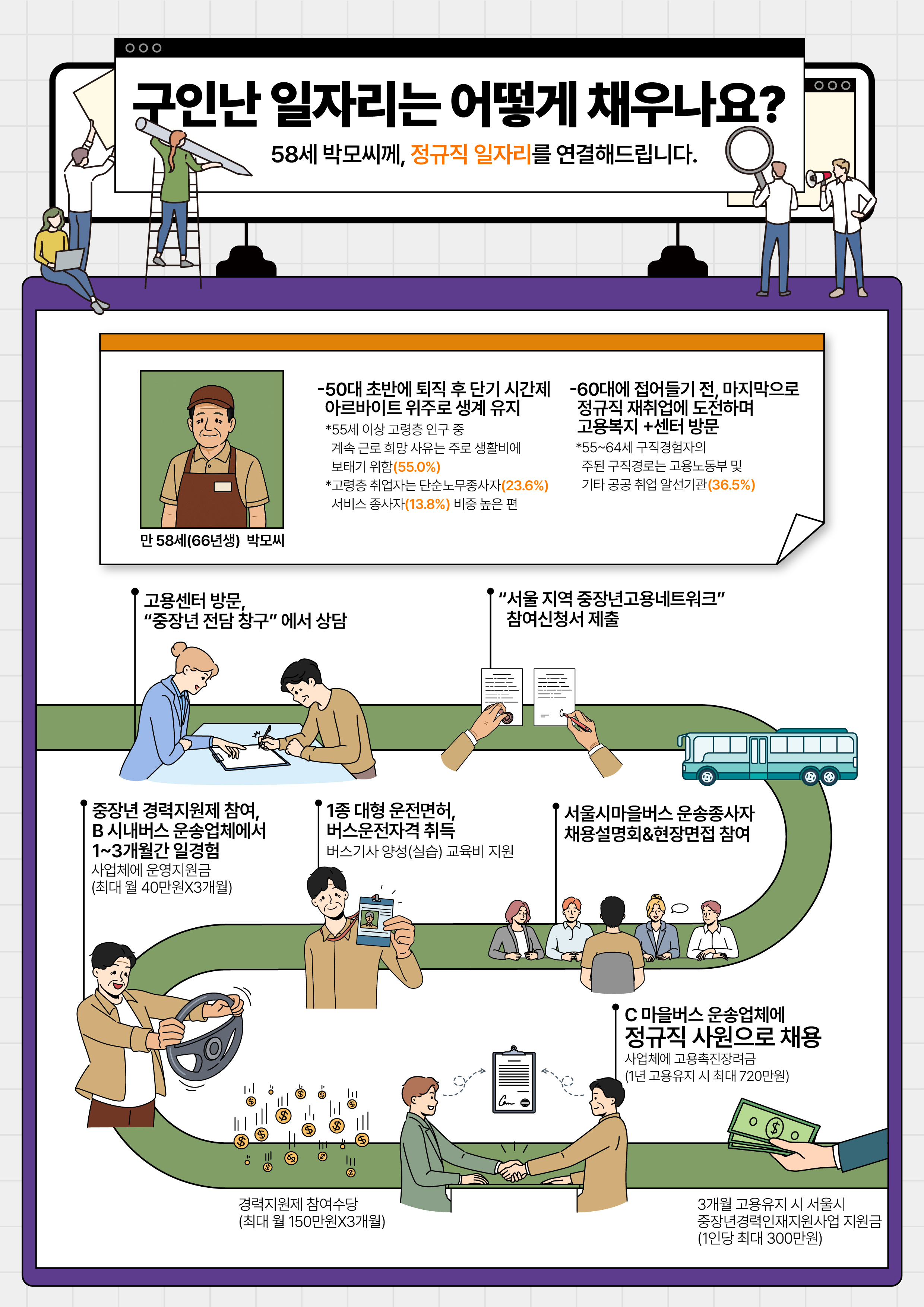 예를 들어 6월부터는 서울시50플러스재단과 협업하여, 미충원율이 높은 마을버스 운송직 취업을 희망하는 50대에게 서울시 유관기관(마을버스 운송조합 등)이 자격취득 비용을 지원하고 고용노동부가 경력지원제를 연계하는 등 시범사업을 실시해 100여 명에게 일자리를 지원할 계획이라고 밝혔습니다.