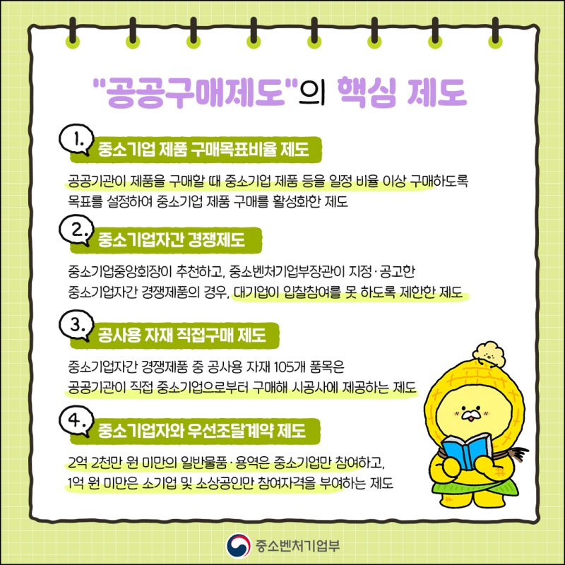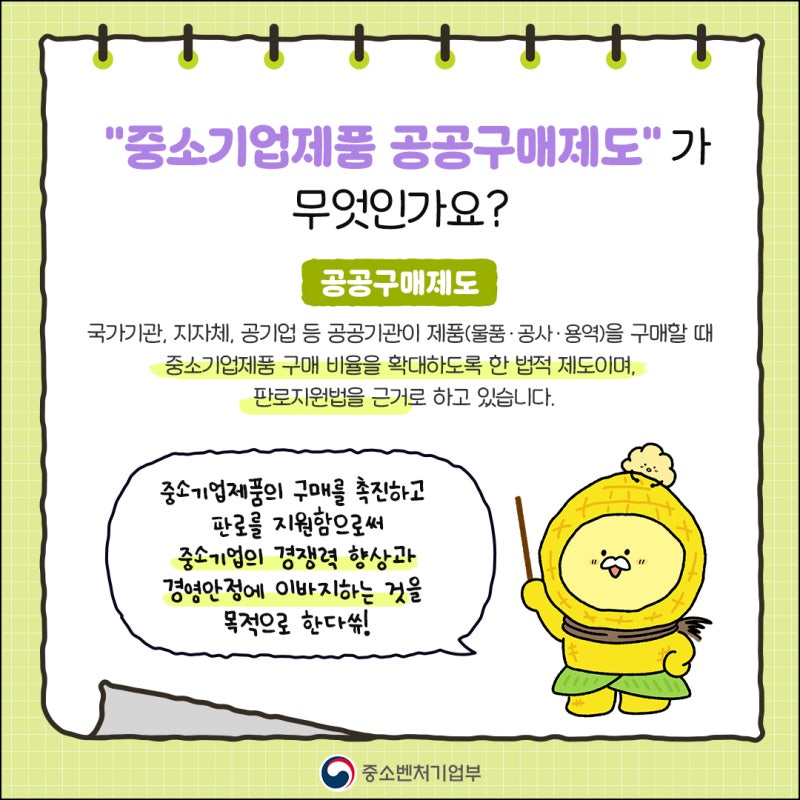 이번 포스팅에서는 국가기관, 지자체, 공기업 등 공공기관이 제품(물품·공사·용역)을 구매할 때 중소기업제품 구매 비율을 확대하도록 한 각종 법적 제도인 공공구매제도에 대해서 안내드리겠습니다.