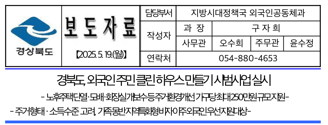 경상북도는 외국인 주민의 열악한 주거환경을 개선하고 안정적인 지역 사회 정착을 돕기 위해 내달부터‘외국인 주민 클린하우스 만들기’사업을 본격 추진한다고 밝혔습니다.