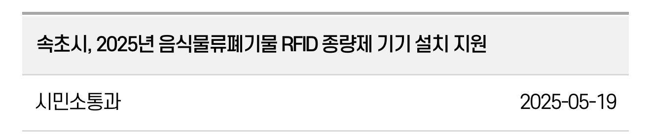속초시는 음식물쓰레기의 효율적 처리를 위해 2025년 5월 19일부터 음식물류폐기물 RFID 종량제기기 설치 지원 사업을 신청받는다고 합니다.