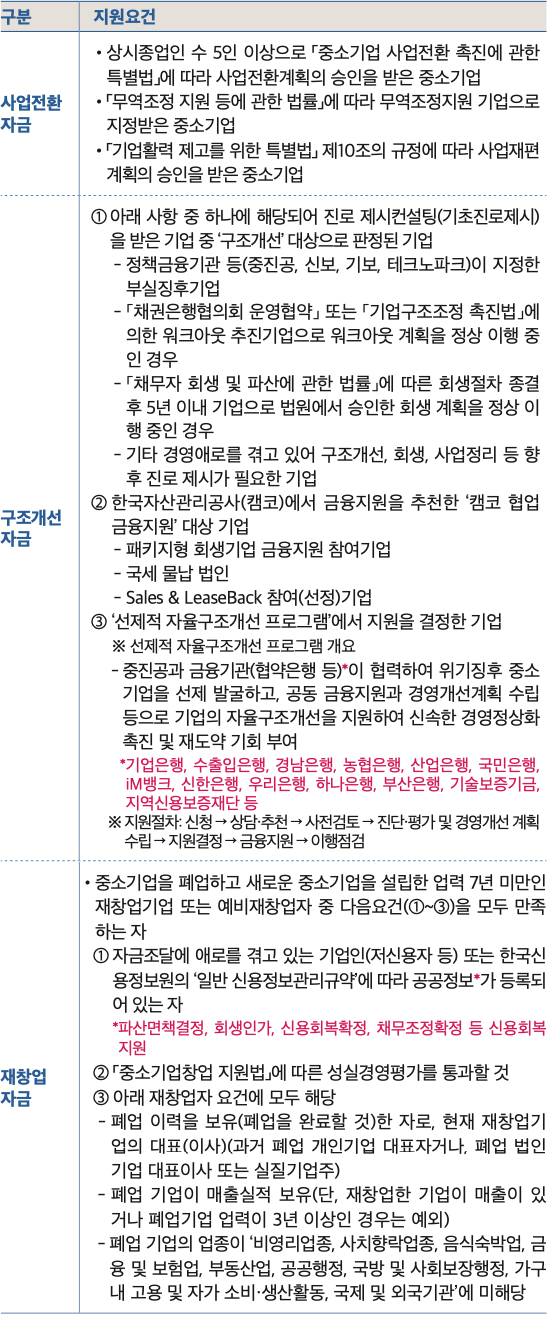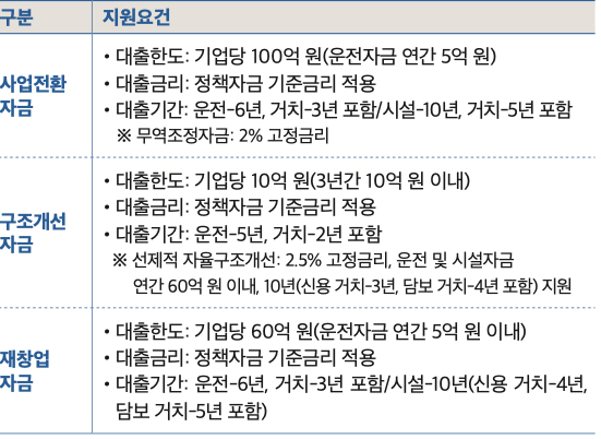 ※ 선제적 자율구조개선: 2.5% 고정금리, 운전 및 시설자금 연간 60억 원 이내, 10년(신용 거치-3년, 담보 거치-4년 포함) 지원