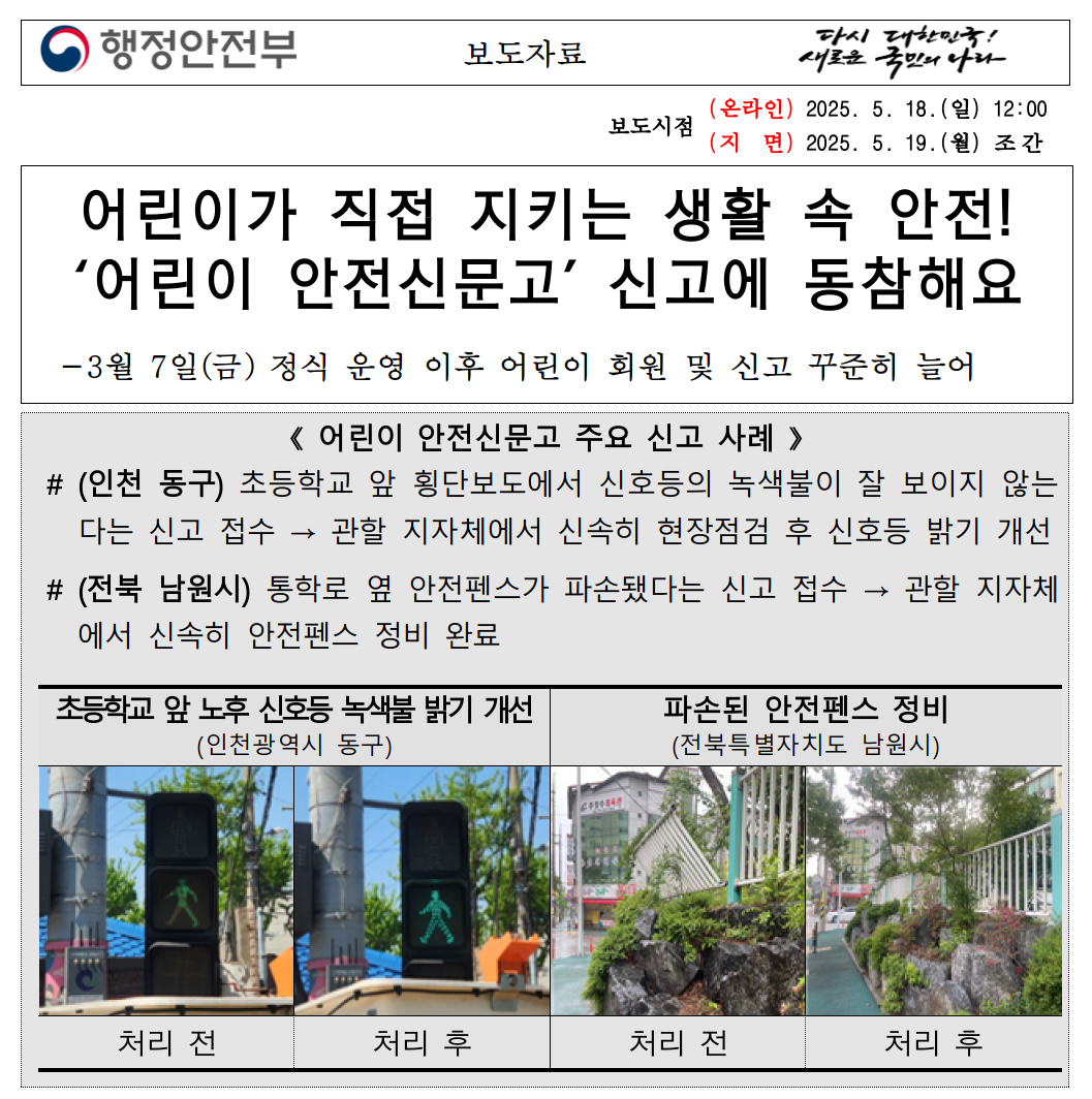 행정안전부는 2025년 3월 7일 ‘어린이 안전신문고’가 정식 개통했다며 국민의 적극적인 이용을 당부했습니다.