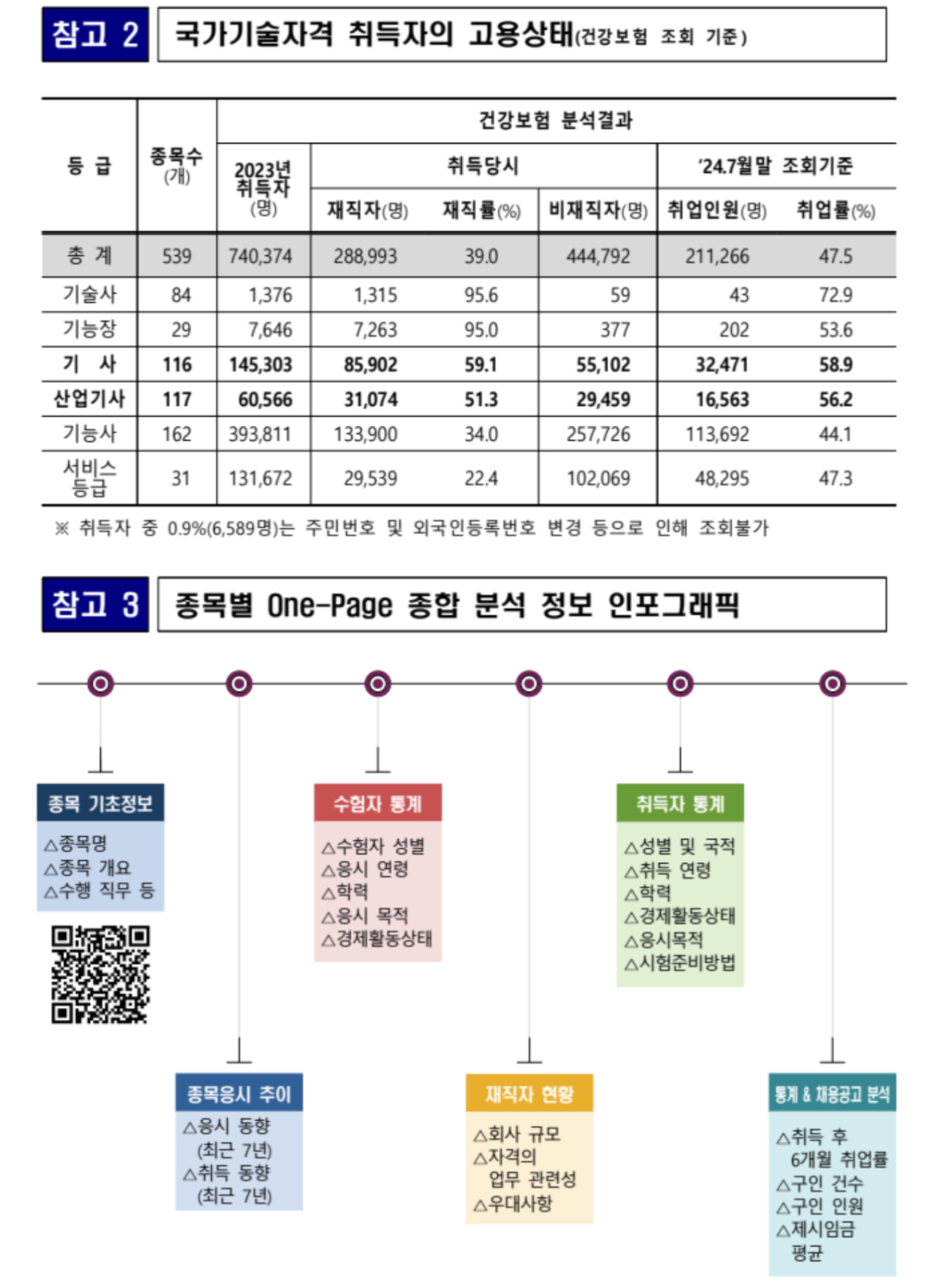이번에 공개된 “종목별 원페이지(One-page) 분석 종합 정보”는 종목별 국가기술자격의 응시인원 추이, 응시자 및 취득자의 통계(성별, 연령, 학력, 응시목적, 경제활동 상태 등), 노동시장 활용 통계(재직자 비율, 취업률 등), 채용공고 분석(구인건수 및 인원, 제시임금 평균 등/ 고용24 기준) 등을 한쪽에 종합하여 한눈에 종목의 특성을 파악할 수 있습니다.