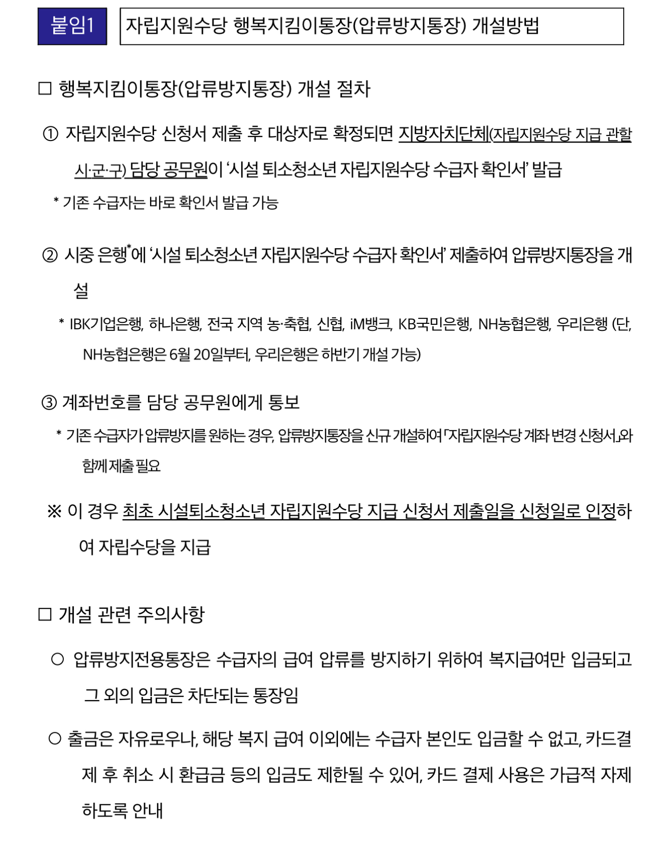 가정 밖 청소년 자립지원수당 행복지킴이통장 발급을 희망하는 가정 밖 청소년은 자립지원수당을 지급하는 관할 시·군·구에서 ‘시설 퇴소청소년 자립지원수당 수급자 확인서’를 발급받아 신분증을 지참하여 통장개설이 가능한 은행을 방문하면 됩니다.