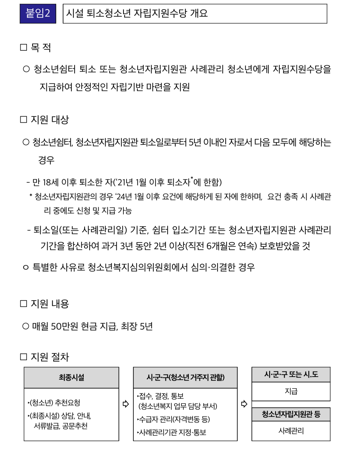 * 자립지원수당: 가정의 보호와 지원을 받을 수 없는 가정 밖 청소년이 청소년쉼터 등 보호시설 퇴소 후 안정적인 자립 기반을 마련할 수 있도록 최대 5년간 월 50만 원 지급