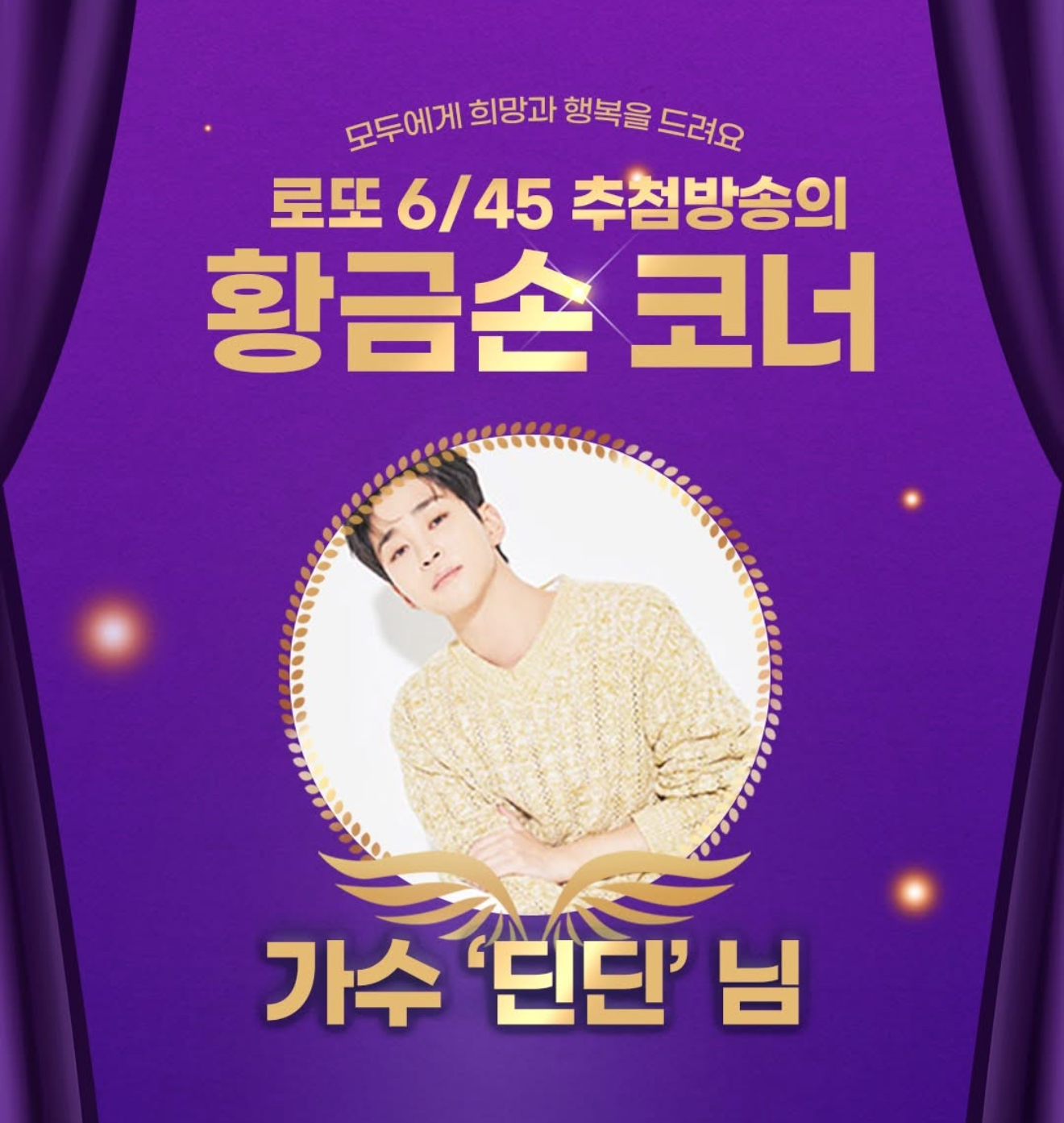 가수 딘딘이 1,174회 MBC '생방송 행복드림 로또 6/45' ‘황금손’으로 출연합니다.