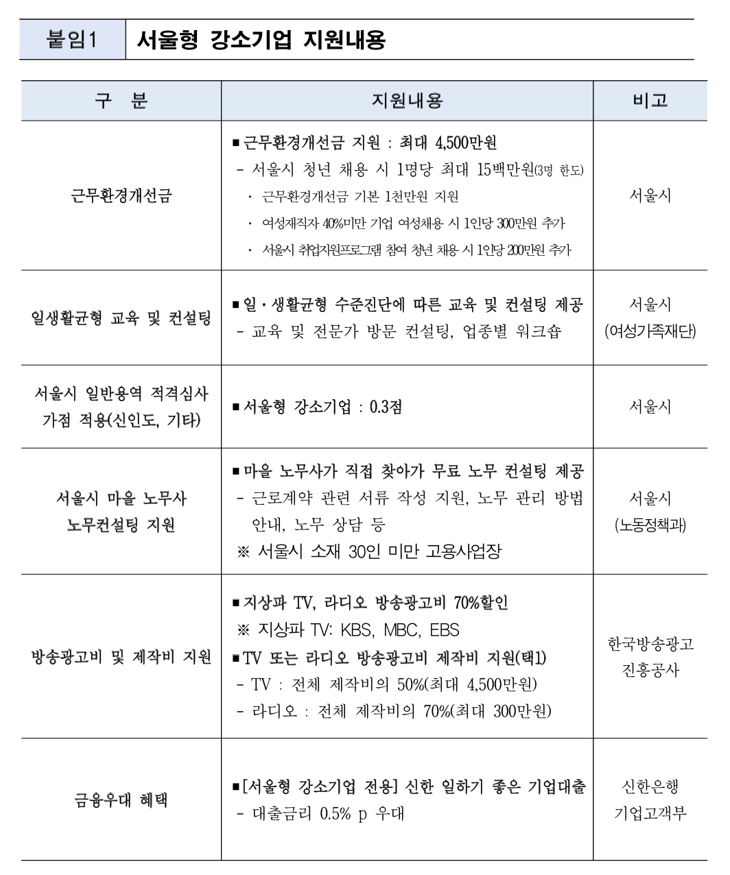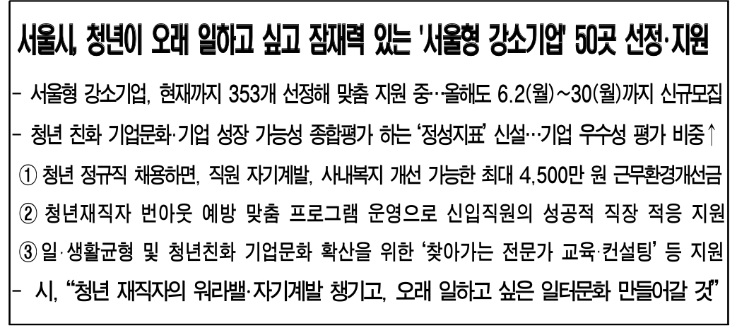 끝으로 주용태 서울시 경제실장은 “서울형 강소기업은 중소기업의 경쟁력 강화와 청년층 일자리 질 제고라는 두 마리 토끼를 잡는 정책”이라며, “우수한 청년 인재들이 중소기업에서도 충분히 성장하고 워라밸과 자기계발을 통해 오랫동안 일할 수 있는 기업문화를 만드는 데 지원하겠다”라고 밝혔습니다.