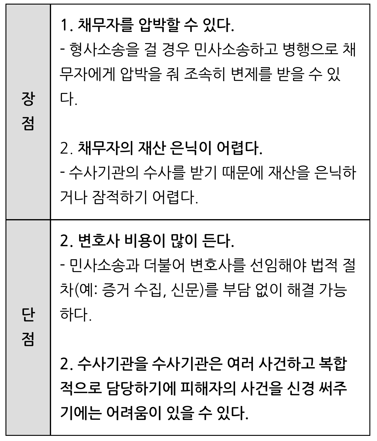 그렇다면 형사소송을 통한 방법의 장점과 단점도 표도 정리되어있으니 참고하시길 바랍니다.