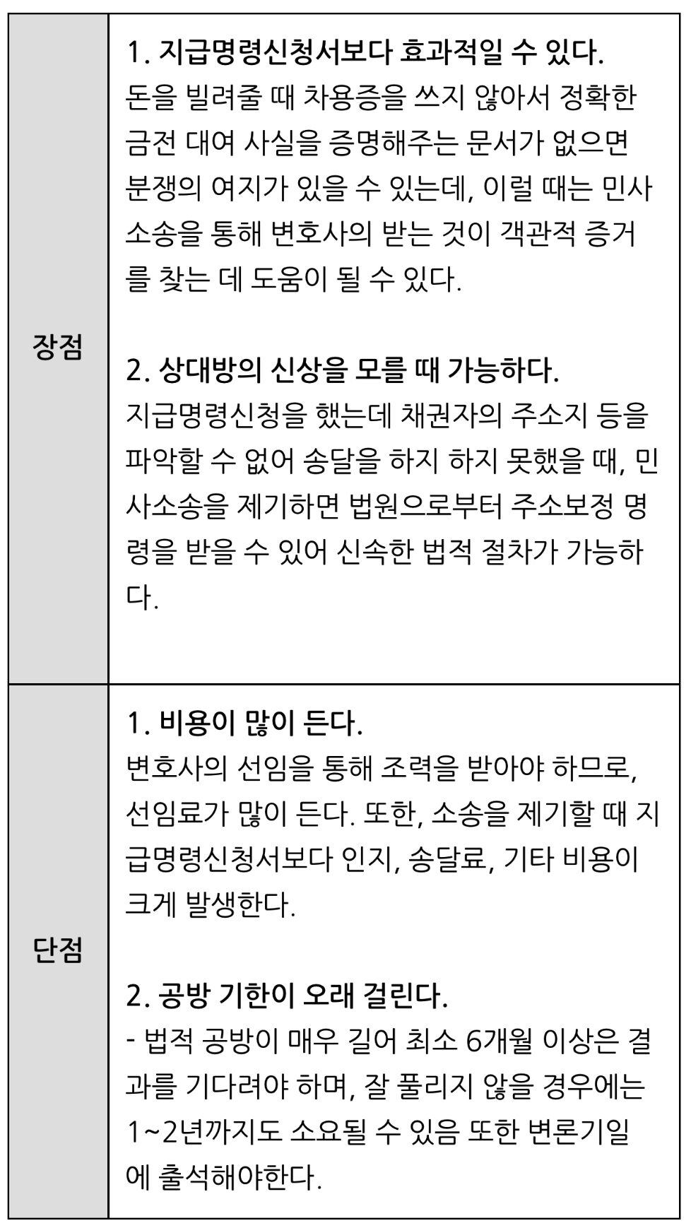 대여금반환청구소송도 장점과 단점이 있는데 위에서 지급명령신청서의 장점과 단점을 표로 정리한 것처럼 대여금반환청구소송의 장단점도 확인해보시길 바랍니다.