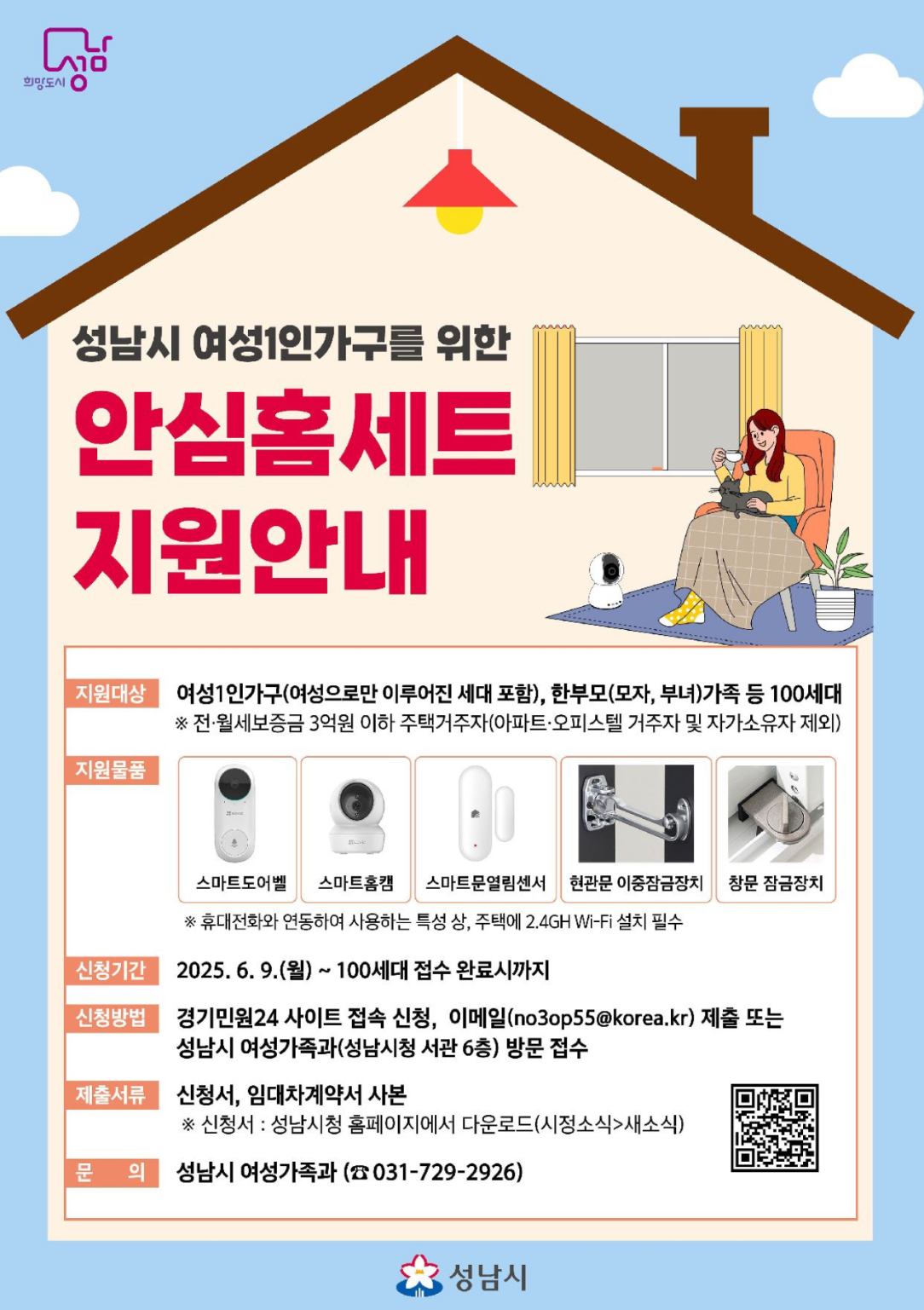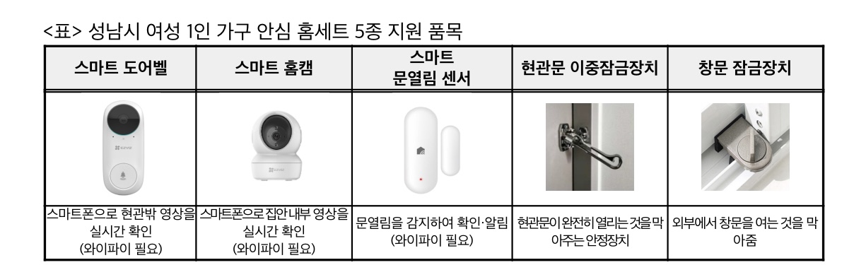 성남시 여성 1인 가구 안심 홈세트 지원 품목은 스마트 도어벨과 홈캠, 문열림 센서, 현관문 이중잠금장치, 창문 잠금장치입니다.
