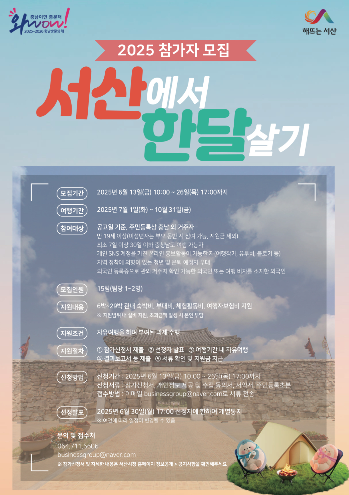 서산 한달살기 신청은 서산시 누리집 공고에 있는 신청서, 계획서 등을 이메일(businessgroup@naver.com)로 제출하면 되며, 모집 기간은 2025년 6월 26일까지입니다.