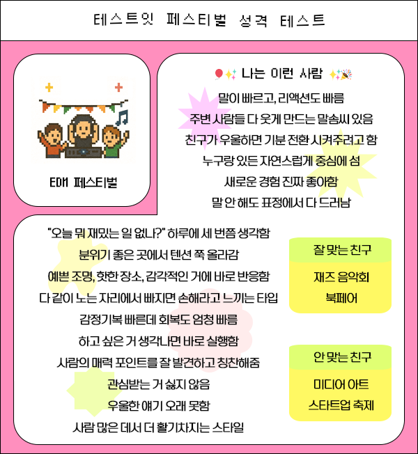 내 성격과 어울리는 페스티벌은 어떤지 알아보는 ‘페스티벌 성격 테스트’에 대해 소개드리겠습니다.
