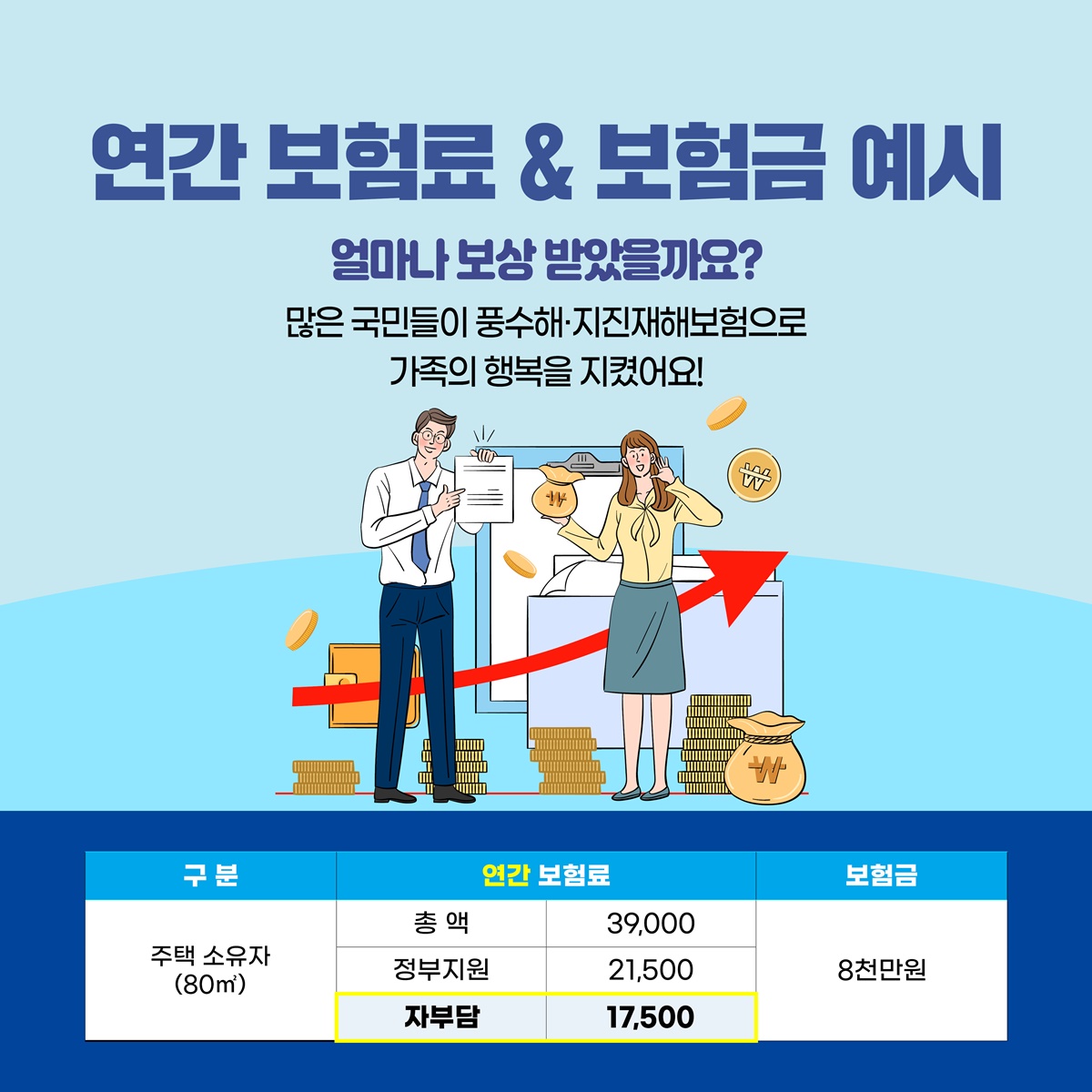 보험료는 약 1만 원에서 대상물 면적별로 달라지며, 보장금액은 피해 유형에 따라 달라진다. 자세한 사항은 각 행정복지센터로 문의하시면 됩니다.