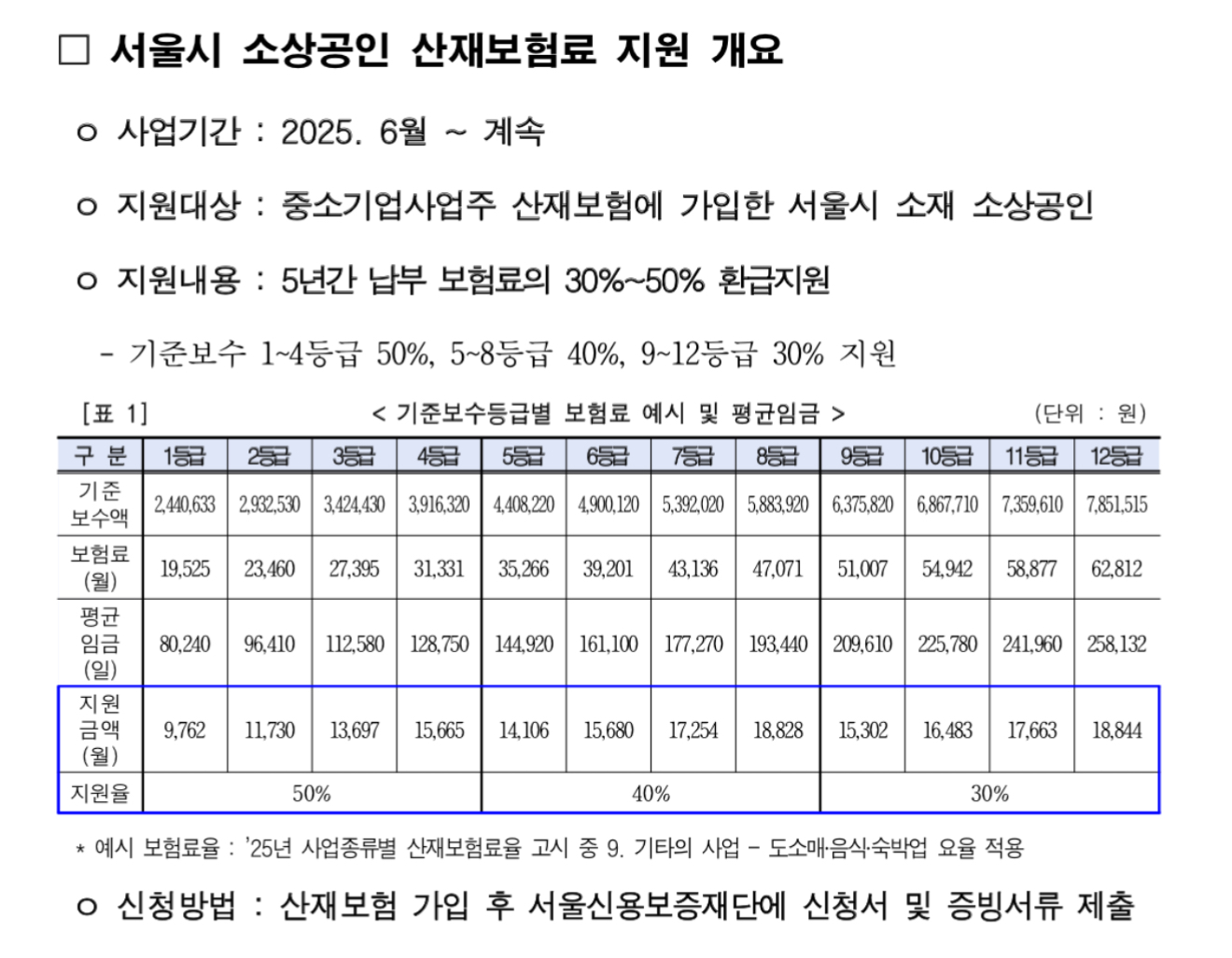 가입자가 선택한 기준보수 등급(1~4등급 50%, 5~8등급 40%, 9~12등급 30%)에 따라 납부 보험료의 30%에서 최대 50%를 서울시가 5년간 환급 지원함으로써 보다 많은 소상공인이 산재보험에 가입하고 예기치 못한 사고에도 생계 걱정 없이 회복할 수 있는 기반을 마련한다는 방침이라고 합니다.