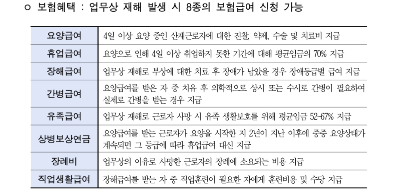산재보험에 가입한 소상공인은 업무상 재해 발생 시 요양급여(진찰·약제·수술·치료비 지급), 휴업급여(요양으로 인한 휴업 중 평균임금의 70% 지급) 등 8종의 보험급여를 신청할 수 있습니다.