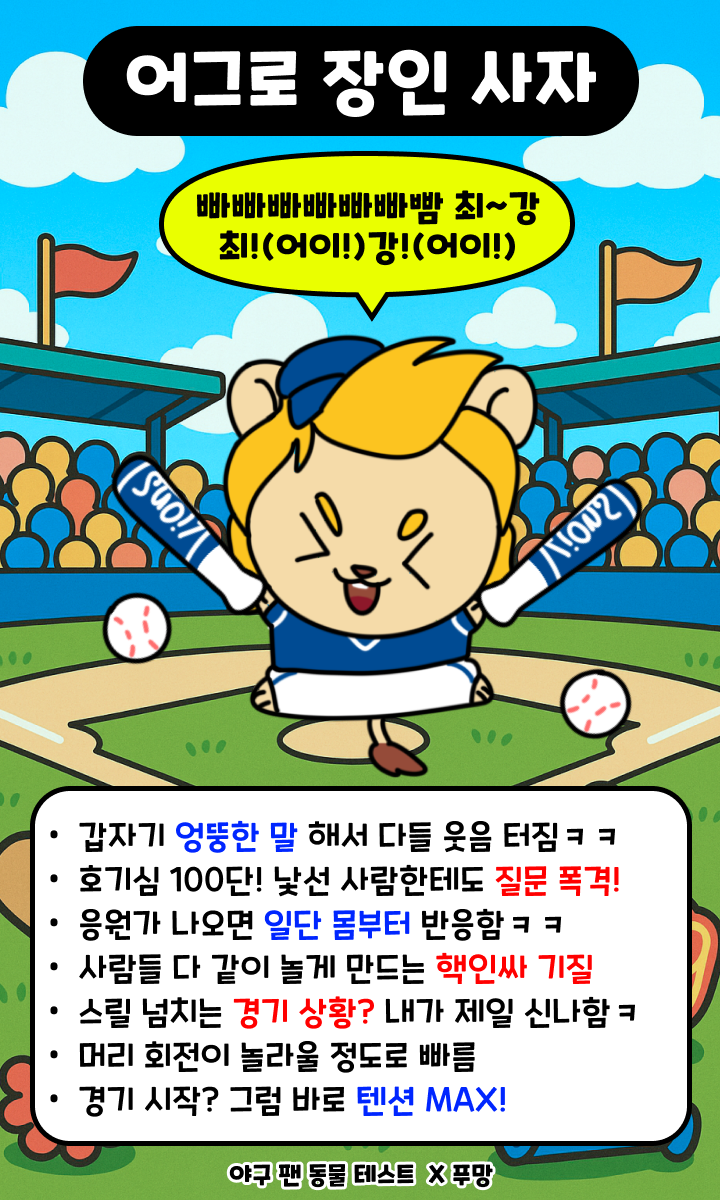 푸망이라는 사이트에서 ‘야구 팬 동물 테스트’라고 나왔는데 여러분들께 소개와 더불어 모든 결과에 대한 mbti 유형도 정리해서 알려드리고자 합니다.