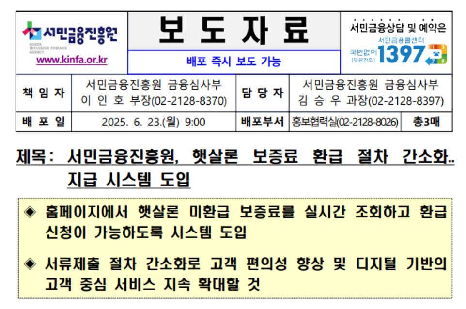 서민금융진흥원이 햇살론 이용 고객의 보증료 환급 절차를 간소화한 ‘미환급 보증료 지급 시스템’을 도입했다고 밝혔습니다.