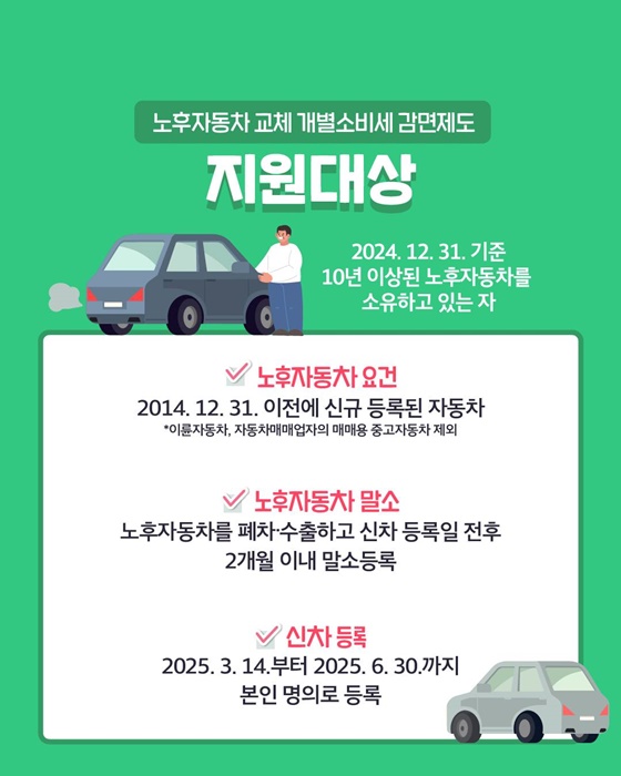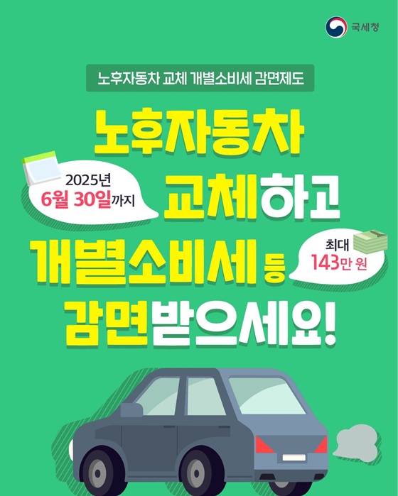 노후자동차 2025년 6월 30일까지 교체하고 개별소비세 등 최대 143만원 감면받으시길 바랍니다.