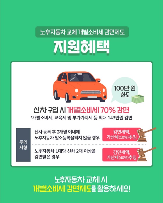 노후자동차 교체 시 개별소비세 감면제도를 활용하시길 바랍니다.