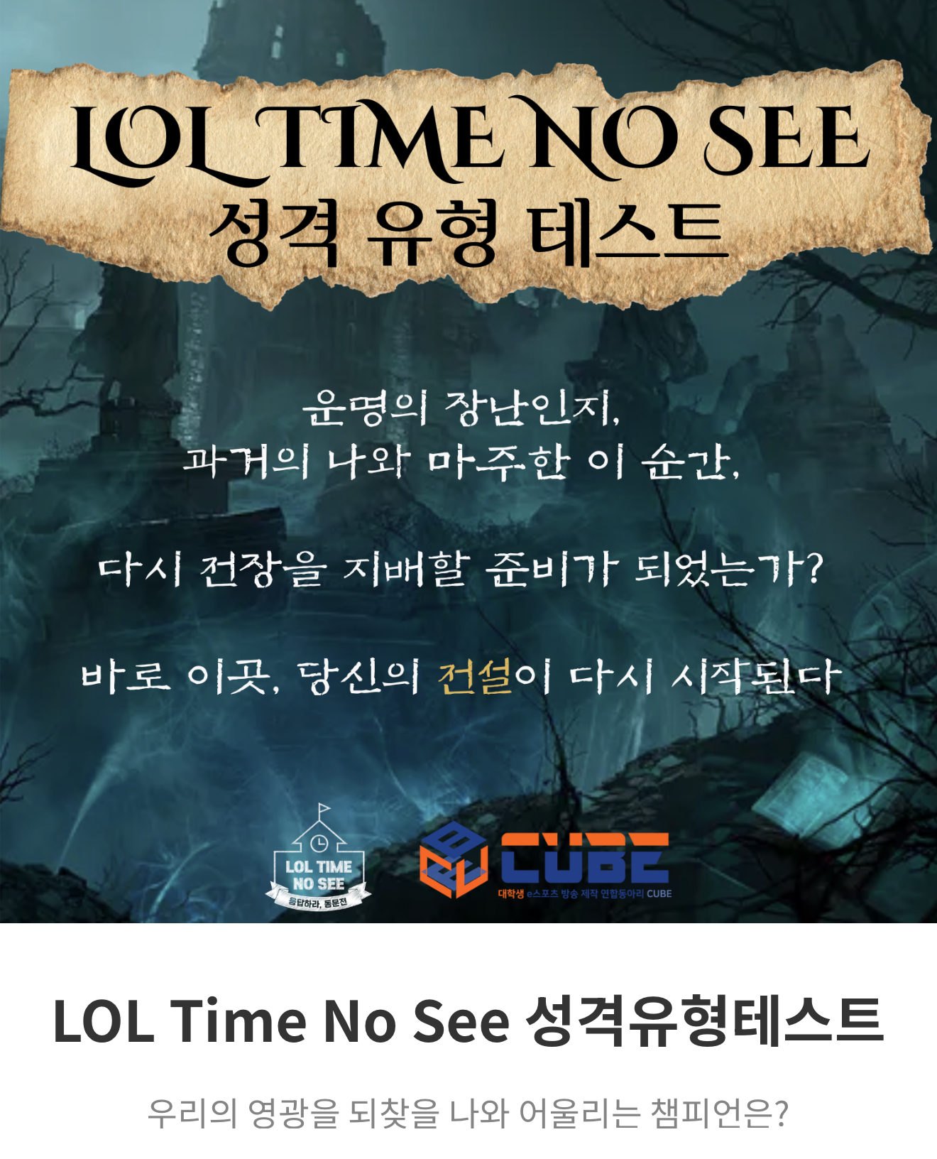 우리의 영광을 되찾을 나와 어울리는 챔피언을 알아보는 ‘LOL TIME NO SEE 성격 유형 테스트’를 소개드리겠습니다.