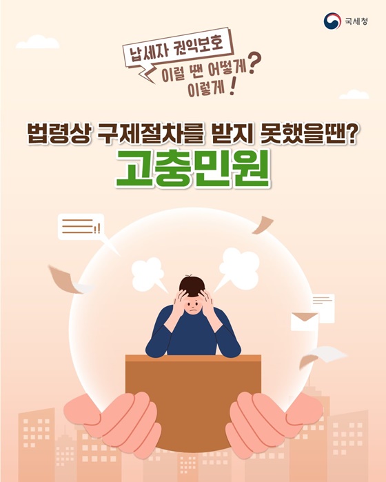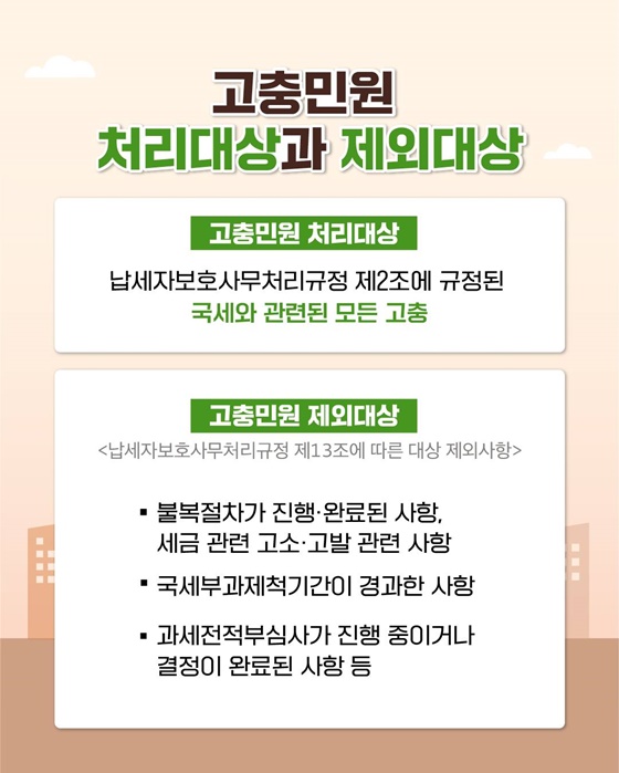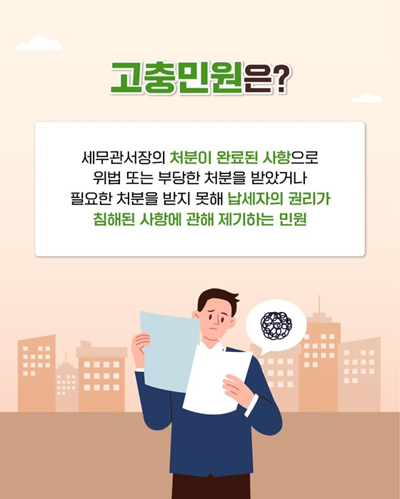 고충민원은 세무관서장의 처분이 완료된 사항으로 위법 또는 부당한 처분을 받았거나 필요한 처분을 받지 못해 납세자의 권리가 침해된 사항에 관해 제기하는 민원을 말합니다.