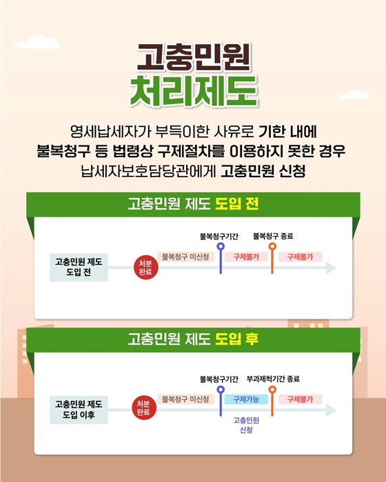 영세납세자가 부득이한 사유로 기한 내에 불복청구 등 법령상 구제절차를 이용하지 못한 경우 납세자보호담당관에게 고충민원 신청