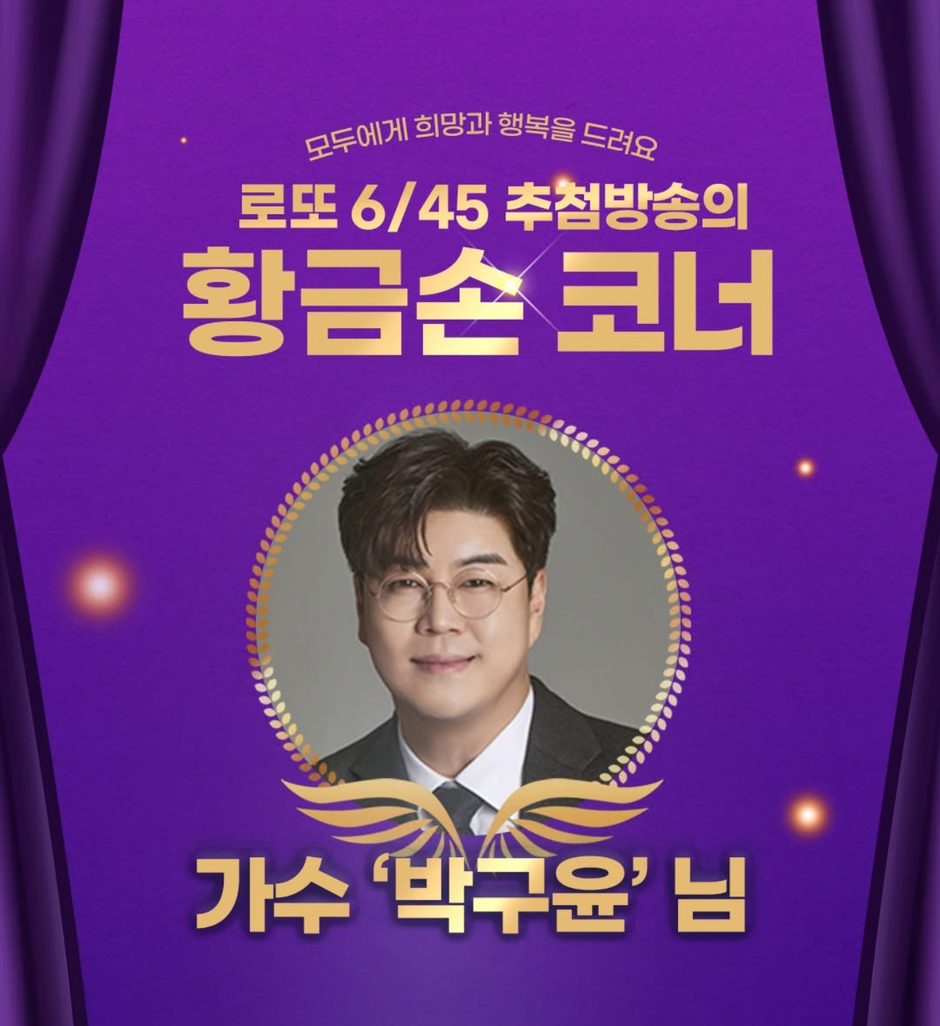 가수 박구윤이 1,178회 MBC <생방송 행복드림 로또 6/45> ‘황금손’으로 출연한다고 합니다.