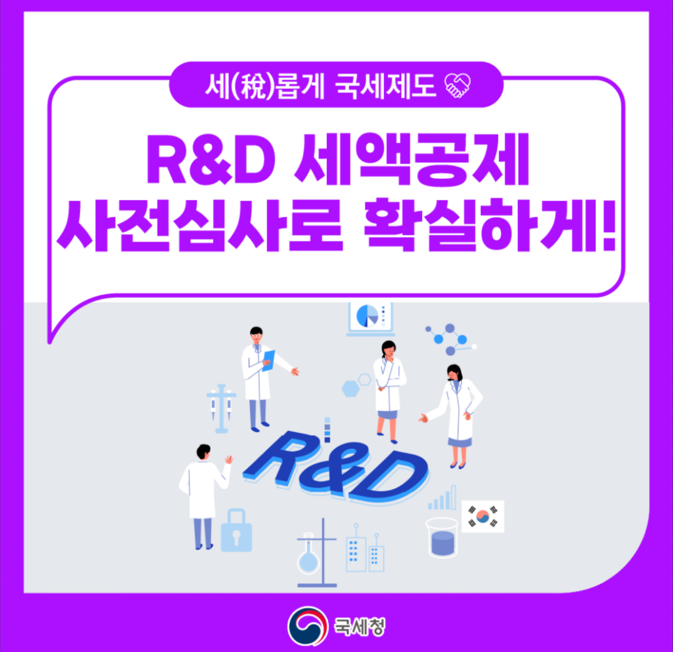 이에 국세청은 악의적인 연구•인력개발비 부당공제에는 엄정히 대응하고 선의의 납세자가 불필요한 세금 부담 없이 안심하고, 연구 개발 활동에 전념할 수 있도록 ‘연구•인력개발비 세액공제 사전심사 제도’를 통해 지원하고 있는데 이 제도를 통해 연구·인력개발비 세액공제 적정 여부를 사전에 확인할 수 있습니다.