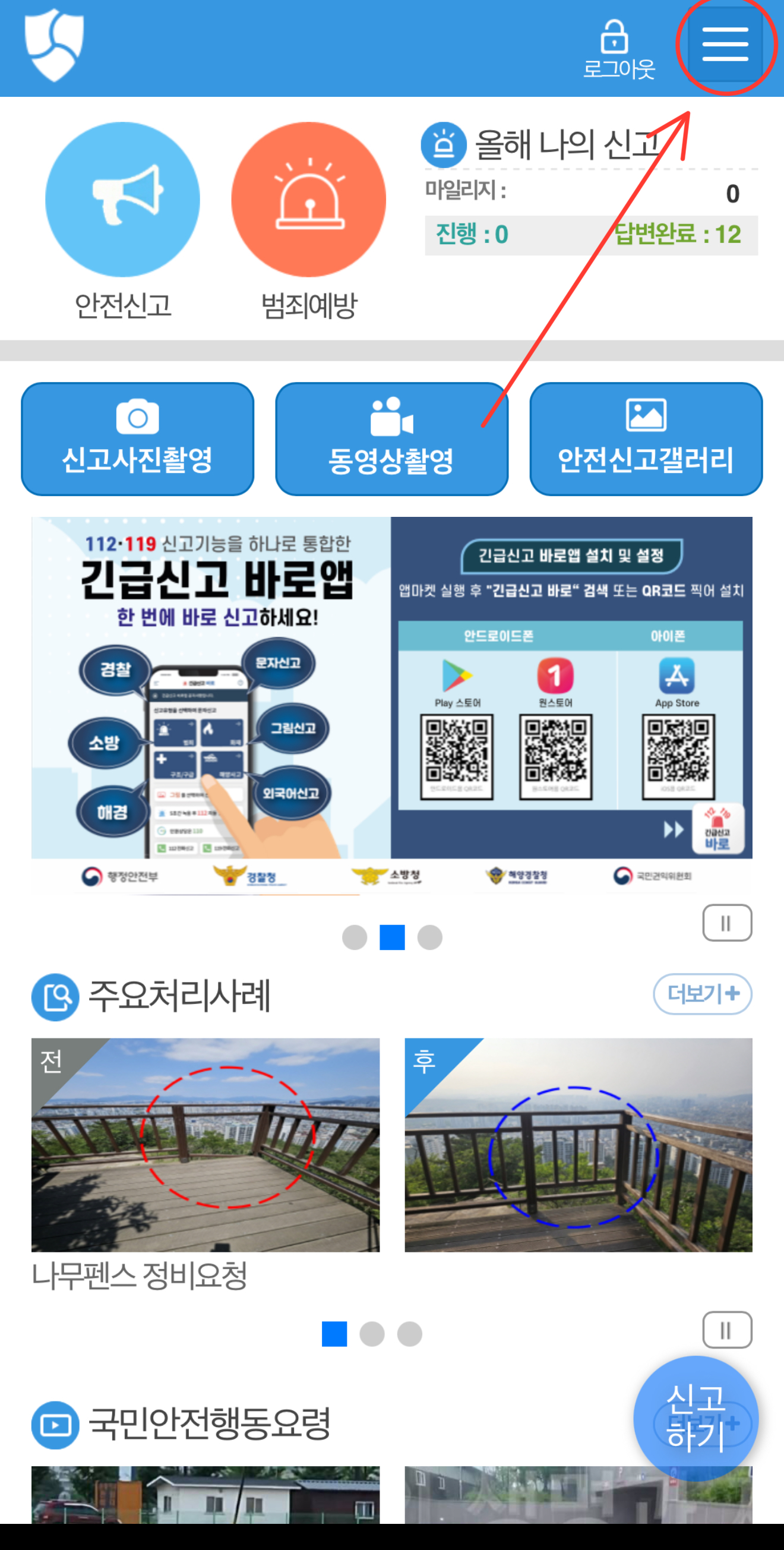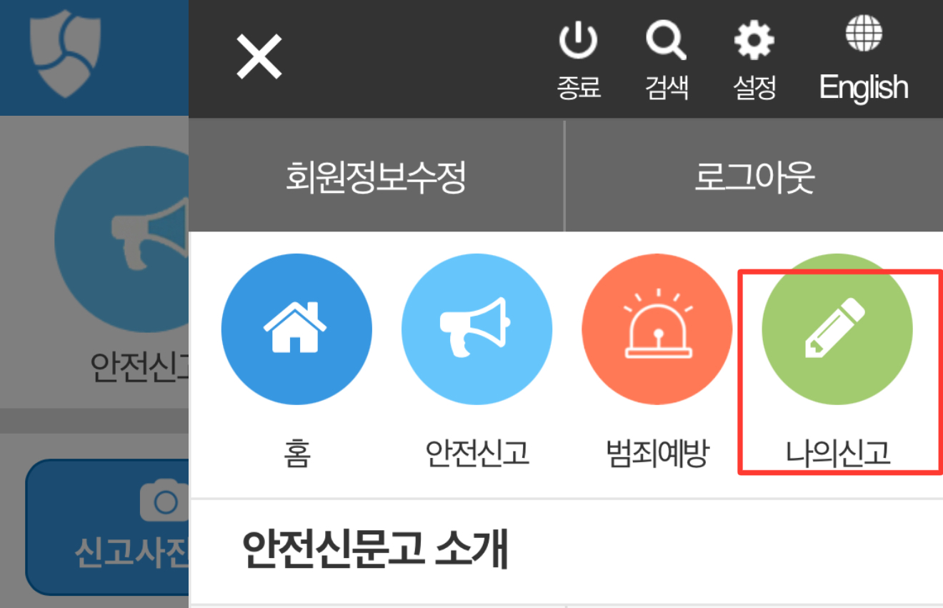 안전신문고 메인화면 우측 상단 메뉴 클릭