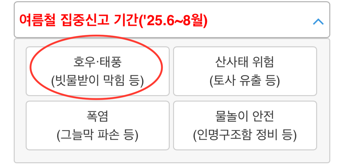 여기서 호우•태풍(빗물받이 막힘 등)을 클릭하시길 바랍니다.